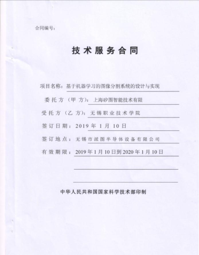 二、毕业设计主要成果 上海矽图智能技术有限公司,主要从事机器视觉处理、自动化设备工程系统的定制与开发,在机器视觉应用领域成果显著。本团队与该公司签订技术服务合同一份,到账金额为1万元整。在本次毕业设计过程中,周文豪同学主要从事LED晶圆计数系统的设计与实施工作,该系统利用机器视觉技术,自动统计晶粒数量。 与矽图公司签订的技术服务合同如下图所示: