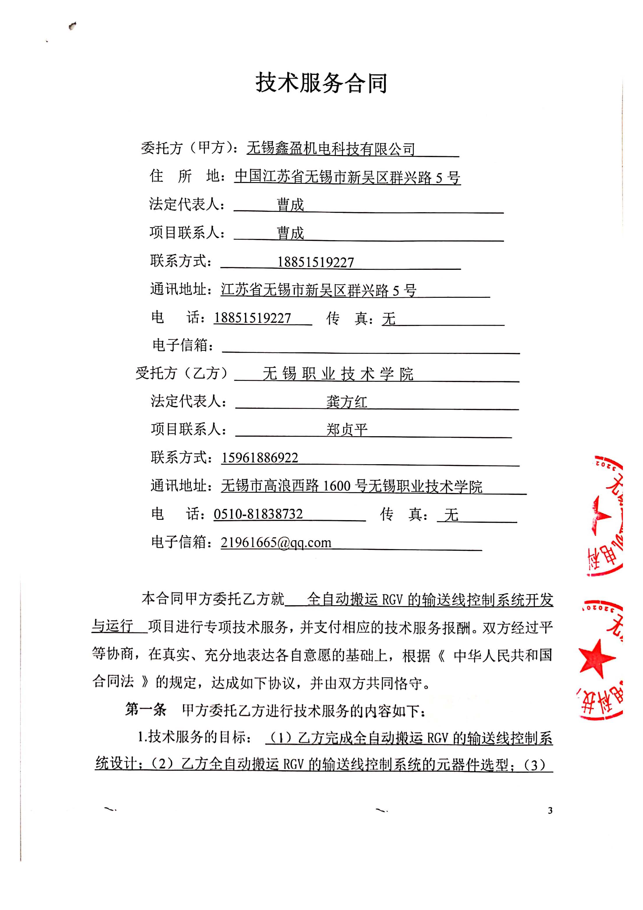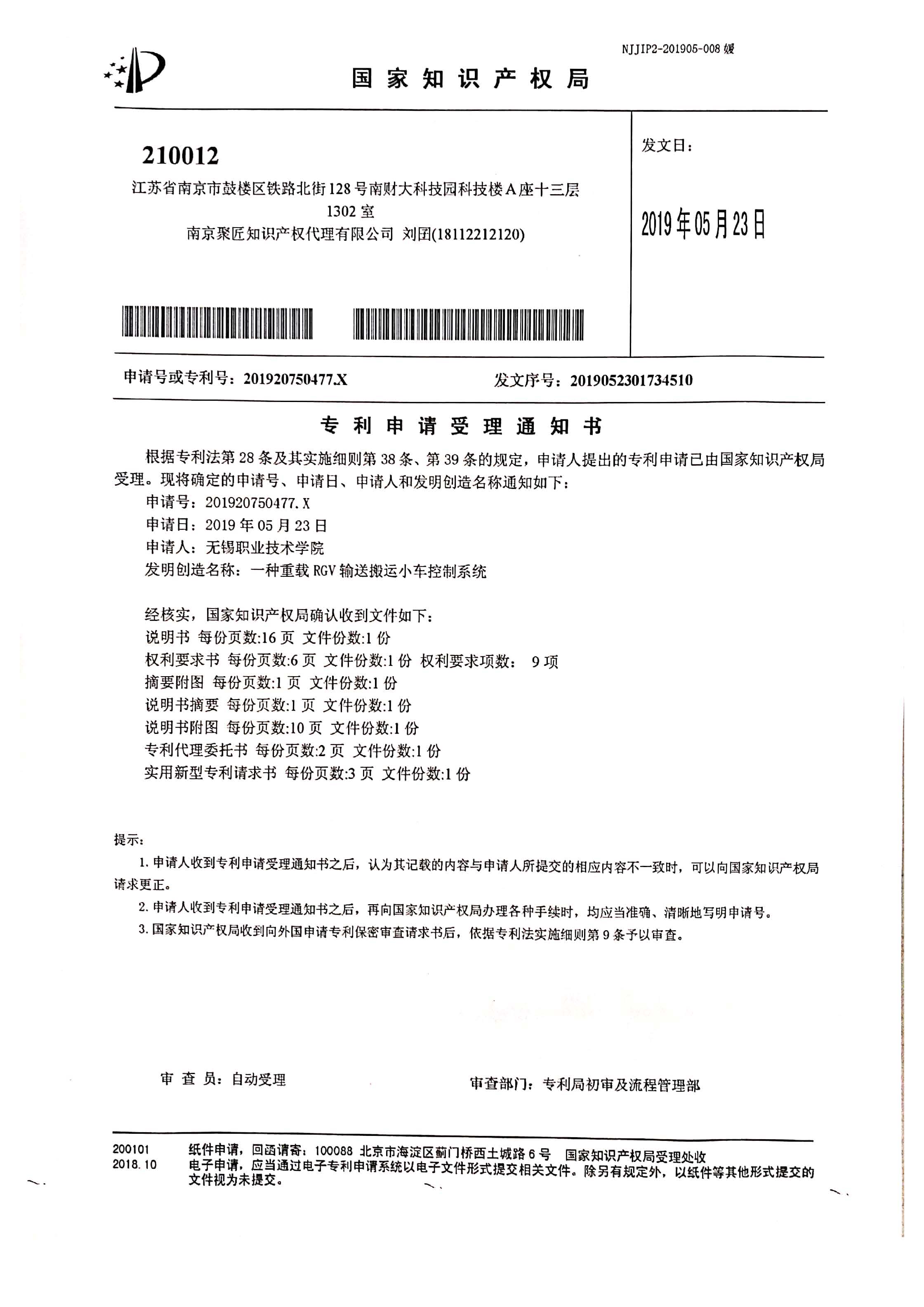 二、主要成果 陈智定同学在参与《全自动RGV的输送线控制系统开发与运行》横向课题,负责设计图纸、编写程序和设备调试的全过程,从而做出该毕业设计,该生做毕业设计同时,获得“一种重载RGV运输小车控制系统”实用新型专利(受理)。