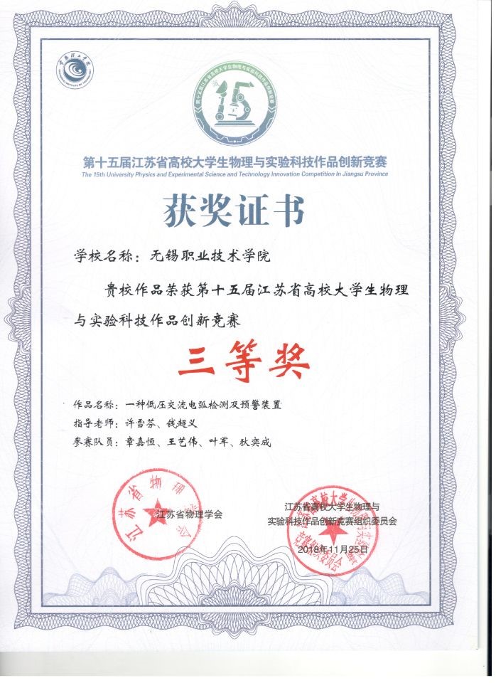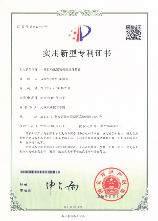 二、主要成果 叶军同学参与华旭奋老师主持的横向课题《宠物管理系统设计与APP研发》横向科技技术服务项目,主要任务是通过人机交互界面、互联网平台对宠物进行智能化系统管理,运用Arduino单片机与ESP8266、HMI、手机APP的多重结合实现不同用户均可控制宠物管理系统的多用户需求。他所编的管理系统和开发的APP已经顺利通过验收,并由委托单位整体包装推广市场,目前已签订了2万元的销售订单,深受企业好评。 在校期间叶军同学还被评为无锡市三好学生,在江苏省高校第十五届大学生物理及实验科技作品创新竞赛获省三等奖、江苏省第五届“互联网+”大学生创新创业大赛中获省三等奖、第十五届“挑战杯”全国大学生课外学术科技作品竞赛获省三等奖、希捷杯创意大赛获一等奖,同时作为第一发明人申获实用新型专利四项,以第一作者发表论文一篇。 这些知识和经验的积累,为他完成《基于用户体验的互联网+宠物管理系统设计与实现》毕业设计,打下了扎实 的基础和提供了技术上保证。 1、江苏省高校第十五届大学生物理及实验科技作品创新竞赛获奖证书