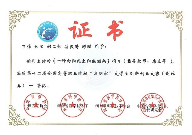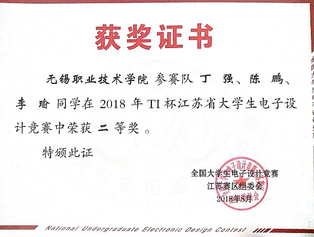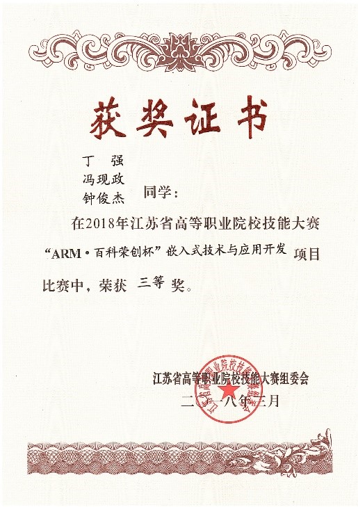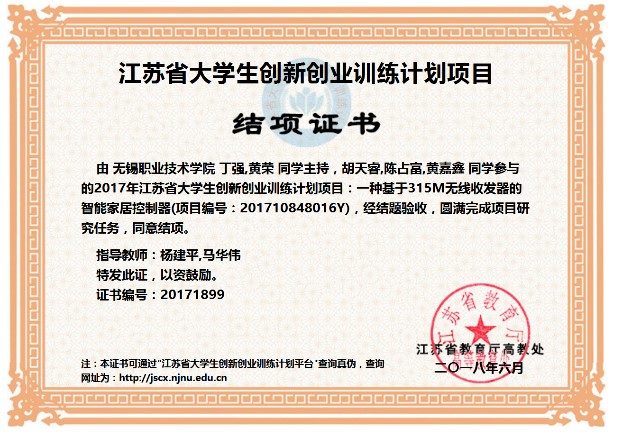 二、主要成果 丁强同学与吴孔培老师主持的《基于蓝牙Mesh的智能家居控制系统开发》校企横向技术服务,完成样品开发,调试与交付,样品得到合作企业的认可与采用,期间申请相关专利一项。 在校期间主要钻研智能电子产品开发,参加全国嵌入式技能大赛获三等奖两次,电子设计竞赛获二等奖两次, “发明杯”创新创业大赛一等奖,参加江苏省大学生创新创业计划项目多项,申获专利10余项。 1、技能大赛获奖证书