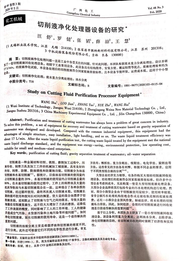 二、主要成果 该毕业设计瞄准金属切削行业的终端处理难点,准确把控切削液净化循环的技术导向,对切削液的劣变机理形成了清晰认识、对常用油水分离技术进行了系统性调研,进而有效协同多种物理方法开发设计出一种小型切屑液净化处理设备,实现切削液的高效高质净化机制,具有较高的创新性。 设备采用过滤、消泡、聚结分离、静置分离的多级策略对切削废液中的不同类型有害物质实现针对性去除;并综合运用流体动力学、两相流聚结原理、浅池原理等科学理论,以理论计算和计算机仿真技术为指导,显著提升净化效率和质量。充分彰显了学生深厚的基础理论、专业知识、技能,以及善观察、勤思考、会动手的优良品质。实践过程中,取得了以下成果: 1、 申请实用新型专利2项、外观专利1项、其中两项已授权。