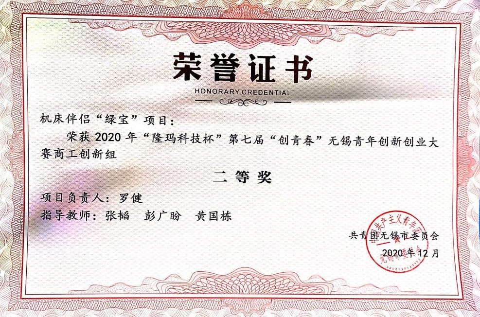 5、 获无锡市第七届“创青春”无锡青年创新创业大赛二等奖。