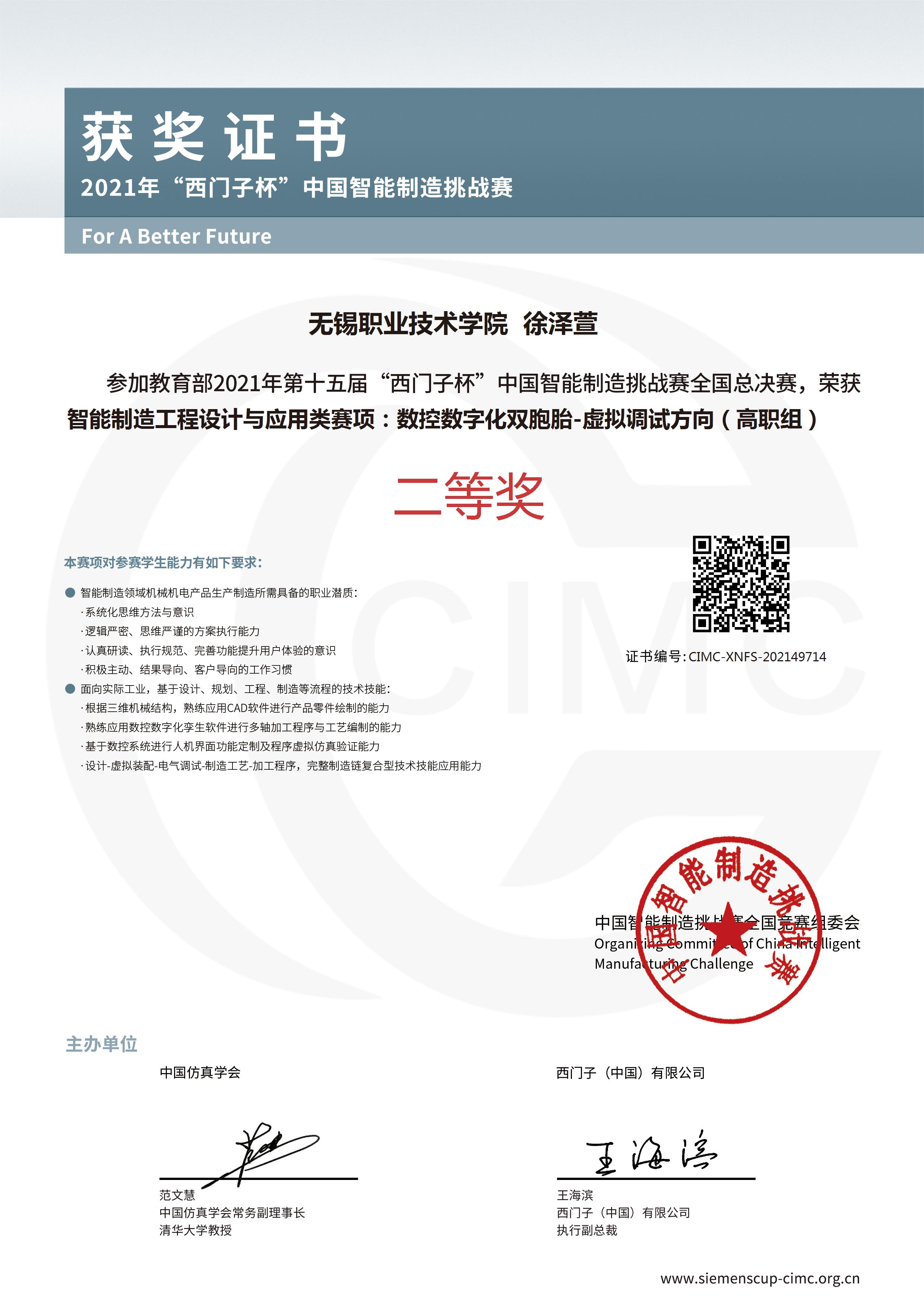 徐泽萱,男,2001年2月出生,玛雅吧 机械技术学院—光电制造与应用技术专业2019级学生。2021年参加教育部中国智能挑战赛,在安徽工业大学进行华东赛区全国初赛,以初赛一等奖成绩晋级全国总决赛,最终获得全国总决赛二等奖第一名的好成绩。通过比赛,锻炼了数字孪生虚拟仿真调试的能力;能独立进行企业机床界面的个性化定制、较为复杂零件的五轴数控机床的加工程序编制。在校期间荣获校学习一等奖一次,二等奖三次,荣获三好学生称号;获校优秀学生干部两次;最终荣获学校优秀毕业生。该生不仅学术成绩优异,身为班干部,严于律己、乐于助人,并发展成为中共党员,为中华民族的伟大复兴继续努力。 2、指导老师-闫向阳