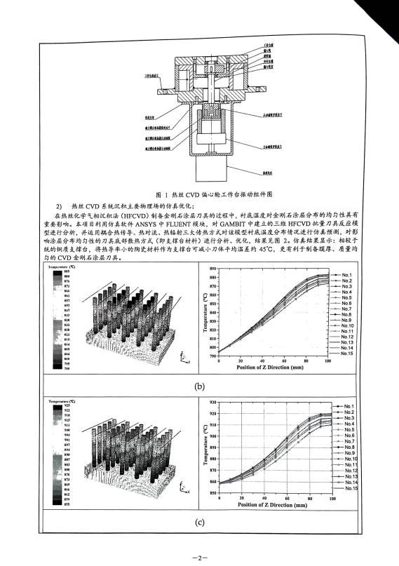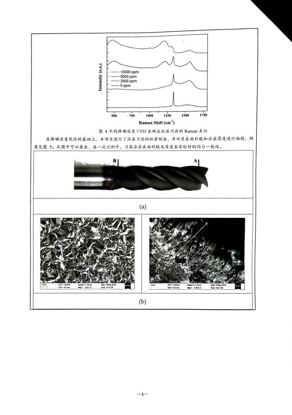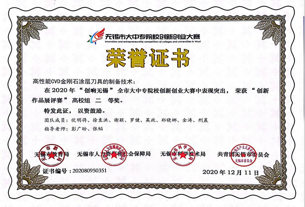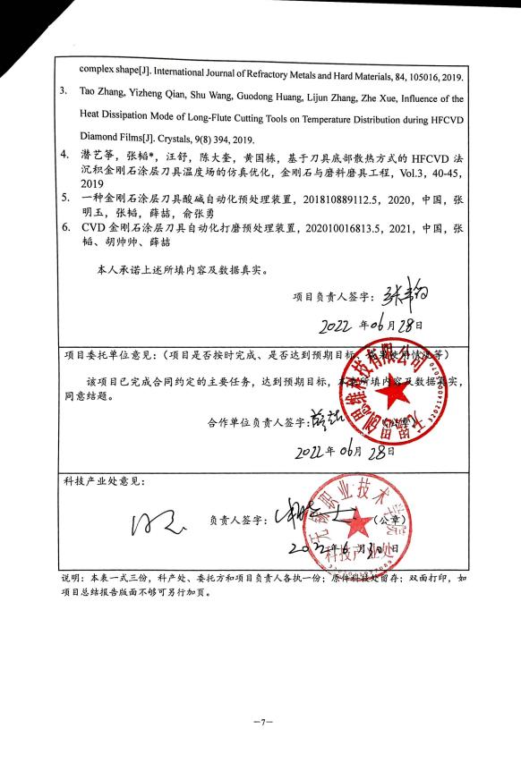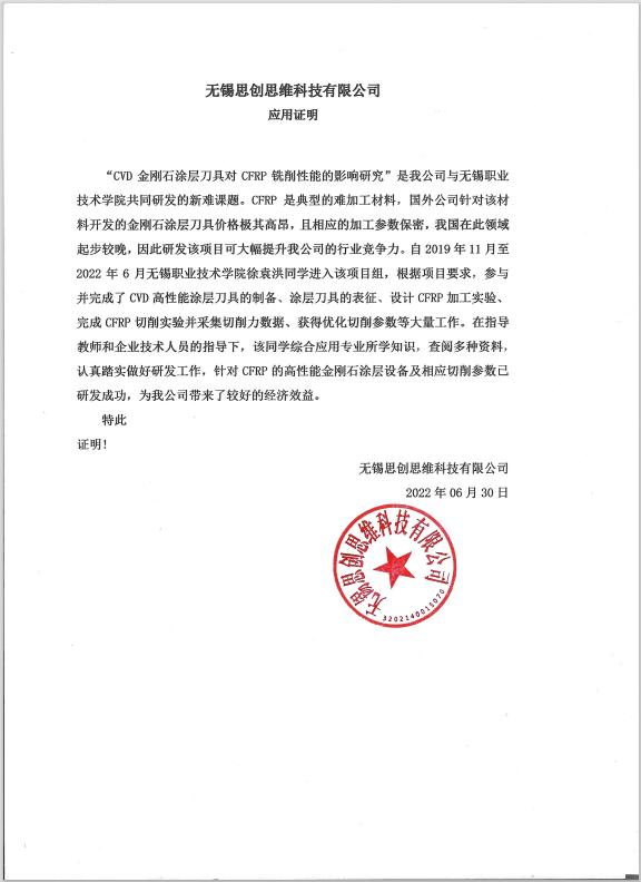 CVD金刚石涂层刀具对CFRP铣削性能的影响研究来源于企业横向课题,毕业设计团队研发的针对CFRP加工的CVD金刚石涂层刀具及相关切削参数已通过了企业验收,横向课题顺利结题,并形成了一定的科研成果,已授权实用新型专利1项,并在2020年“创响无锡”比赛中获二等奖。 1、 企业应用证明
