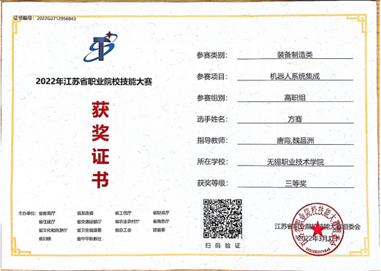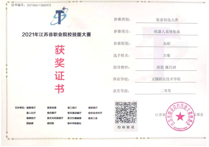 方骞,男,共青团员,2000年1月生,玛雅吧 开源创新创业学院2020级顾秋亮创新班学生。在校期间获得国家奖学金、校年度人物等荣誉。积极参加创新创业竞赛获得第八届中国国际“互联网+”大学生创新创业大赛国赛金奖、江苏省职业院校创新创业大赛省一等奖、“挑战杯”江苏省大学生创业计划竞赛银奖、江苏省职业技能比赛二等奖等10余项省级以上竞赛荣誉。主持江苏省大学生创新创业项目一项;申报发明专利3项,实用新型专利4项,软件著作权1项。获工业视觉编程中级工程师认证。 2.指导老师—唐霞