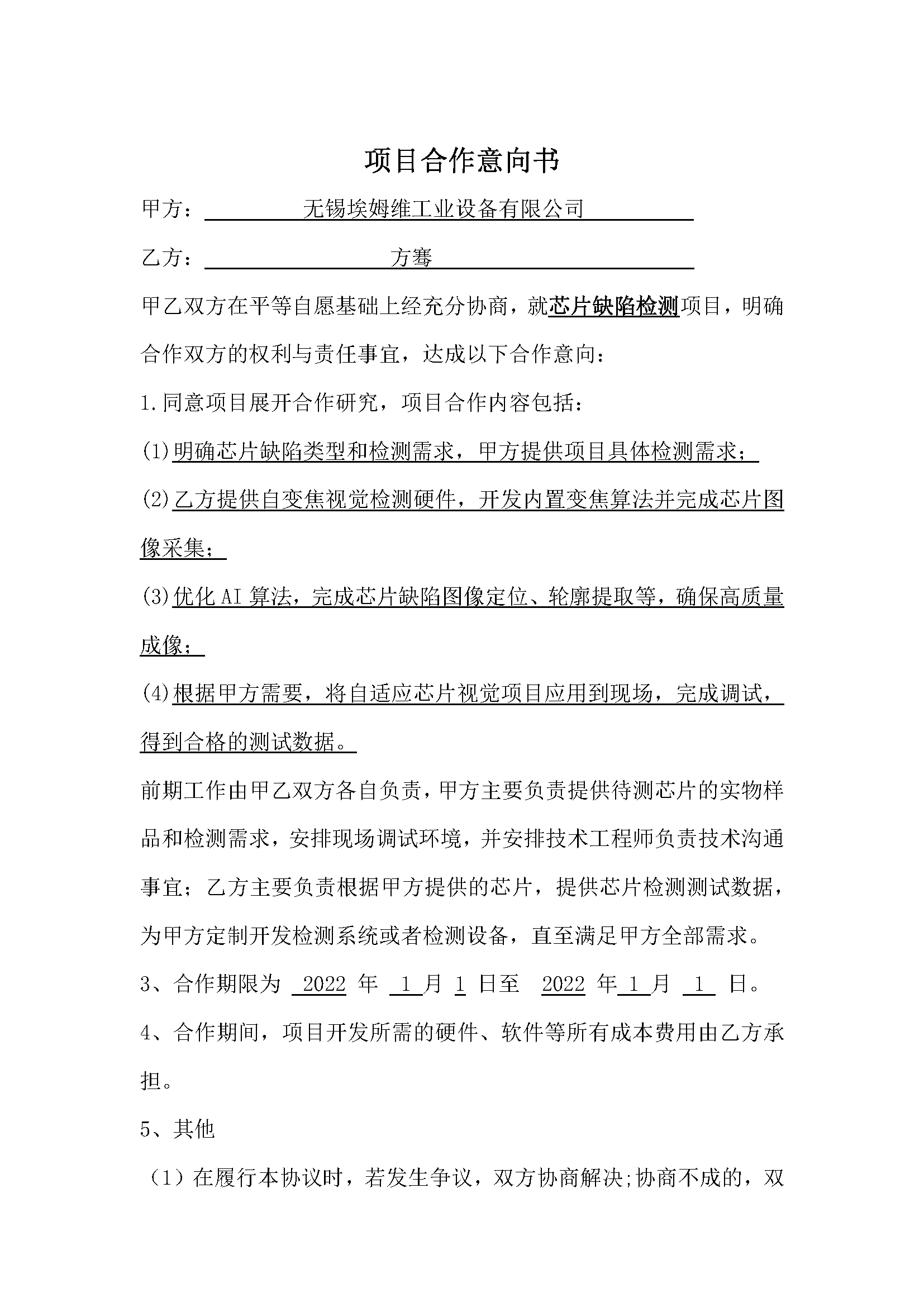 魏昌洲,高级技师,1+X数控设备维护与维修职业技能等级证书培训讲师、考评员。从事智能装备制造技术专业、机械电子专业的教学和研究工作。指导学生参加全国互联网+创新创业大赛获金奖,指导学生参加“挑战杯”江苏省大学生创业计划竞赛获银奖,指导学生参加江苏省职业院校创新创业大赛(创意组高职项目)获一等奖,指导学生参加全国职业院校技能大赛以及江苏省职业技能比赛以及行业技能比赛20余项,并获得二等奖等以上,参加江苏省教学能力比赛获一等奖等。 二、主要成果 1.项目合作意向书 1.1无锡埃姆维工业控制设备有限公司项目合作意向书