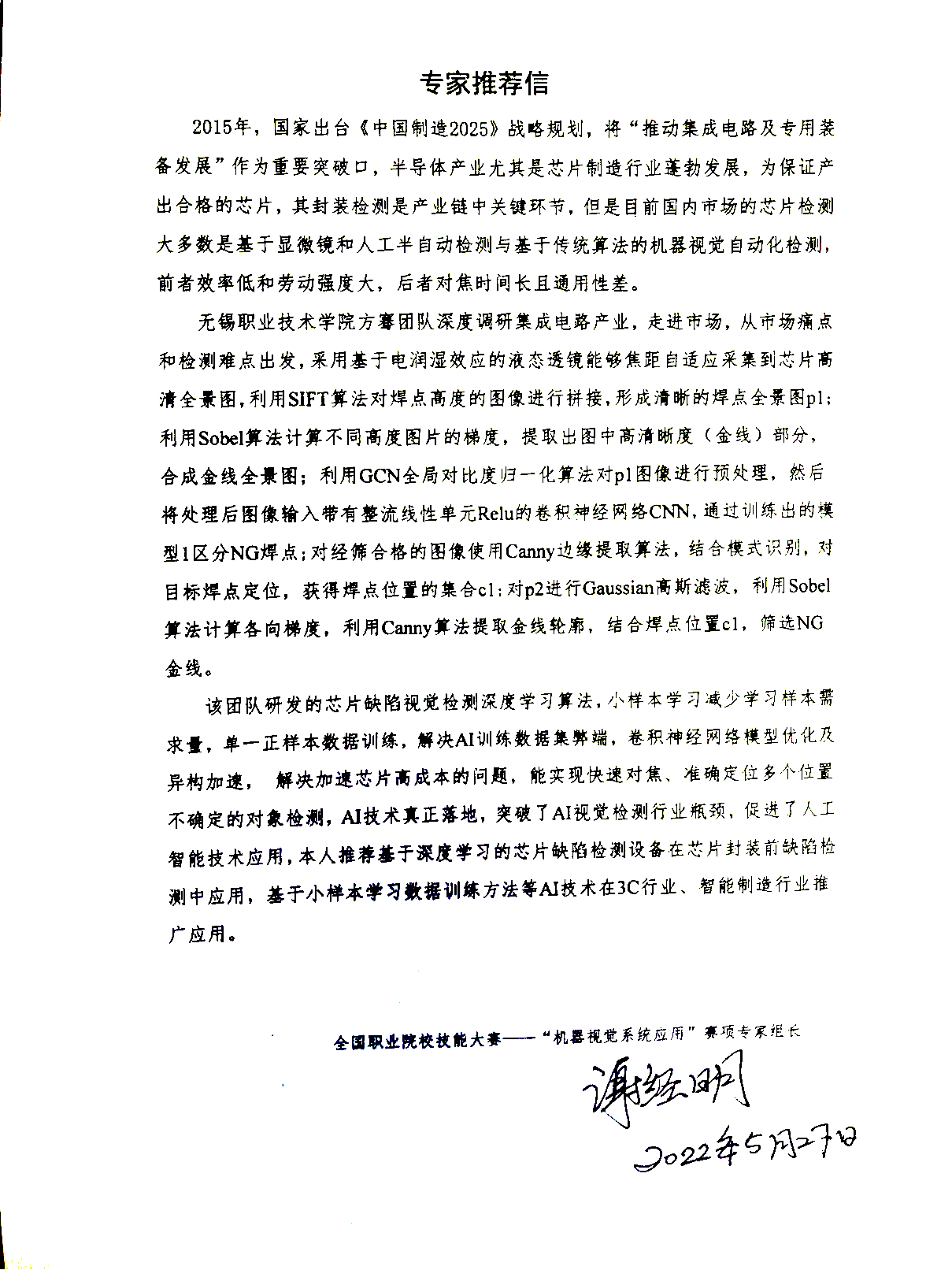 4.行业专家推荐 全国职业院校职业技能大赛高职组“机器视觉系统应用”赛项命题专家组组长——华中科技大学谢经明博士推荐信。