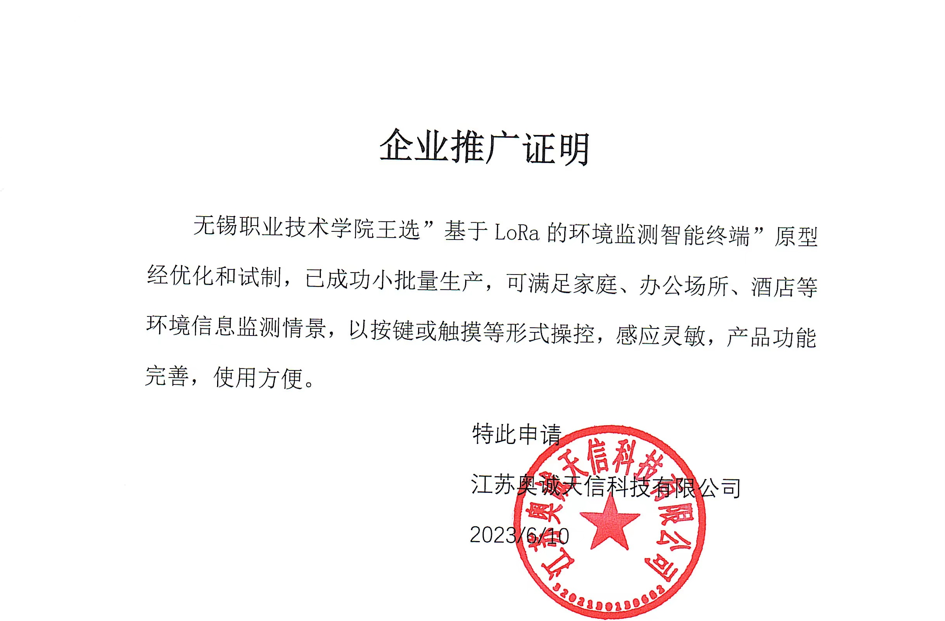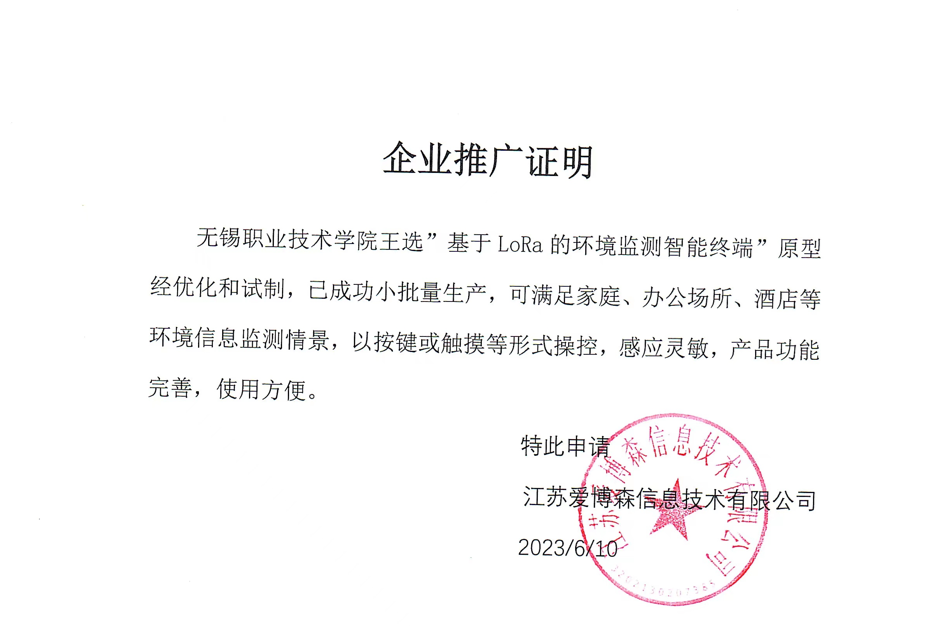 2.企业推广证明江苏爱博森信息技术有限公司以基于LoRa的环境监测智能终端产品为原型试制了应用于家庭、办公场所、酒店等情景的环境信息监测智能终端,以按键或触摸等形式操控,感应灵敏,产品功能完善,使用方便,已进行小批量生产和推广。
