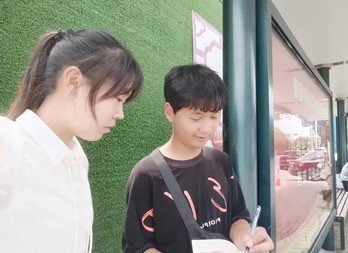 图1:彭雨雨同学正在吴江公交站台开展乘客对吴江客运集团客运服务质量调研