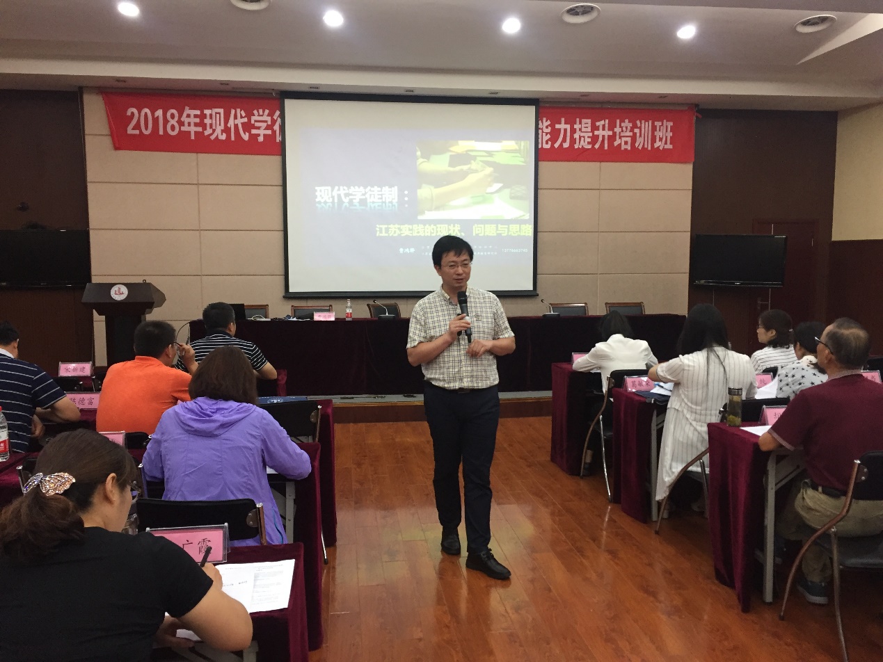 开班仪式后,曹主任做了题为“现代学徒制:江苏实践的现状、问题与思路”的讲座。在2天的培训时间里,学员们将通过专家讲座、现场交流等途径,了解人才培养与企业人才发展的内在联系,理清企业人才需求与人才培养融合的建设思路,掌握现代学徒制人才培养与企业人才需求的对接培养方法,提高企业管理人员人才培养能力,带动企业的整体发展。