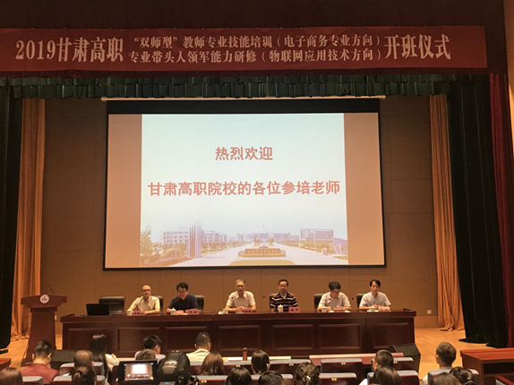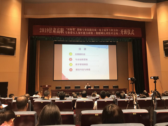 2019年7月15日,由物联网技术学院、管理学院分别承办的2019年甘肃高职专业带头人领军能力研修班(物联网应用技术)、“双师型”教师专业技能培训班(电子商务)在我校综合楼辅楼报告厅顺利开班。副校长周桂瑾、继续教育学院、物联网技术学院、管理学院分管领导和来自甘肃省20余所高职院校近60位学员参加了开班仪式。