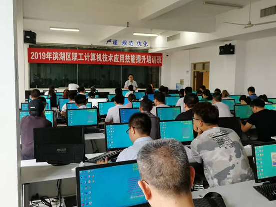 8月4日上午,我校承办的滨湖区职工计算机技术应用技能提升培训班在物联网技术学院图文信息中心C楼504正式开班。滨湖区工会和各街道相关负责人,我校继续教育学院、物联网技术学院相关负责人和任课教师,以及来自滨湖区各企业的69位学员共同参加了开班仪式。
