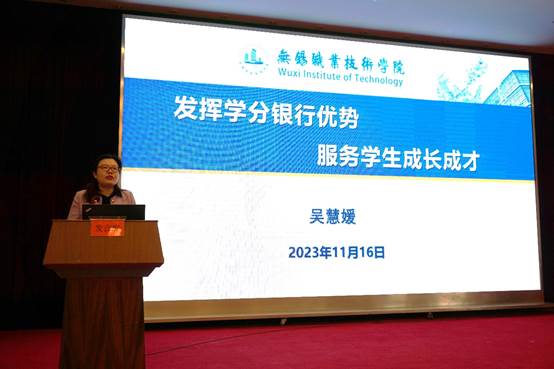 我校吴慧媛副校长出席会议,并以《发挥学分银行优势,服务学生成长成才》为题,就我校开展学分银行体系建设的探索与实践进行了交流分享。吴慧媛从学校办学特色、学分银行建设背景、校本实践、建设成效等方面介绍了我校学分银行建设情况。吴慧媛说,学校将继续在学分银行平台建设、课证融通、1+X证书制度试点、学分认定及转换流程等方面,紧跟江苏省终身教育学分银行建设步伐,并加强与兄弟院校合作交流。