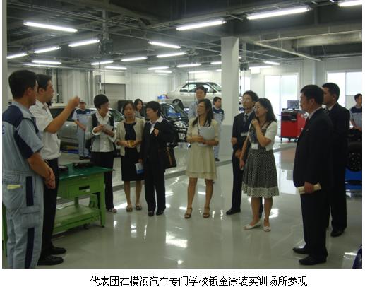 在日本期间,代表团访问了四所汽车类学校。第一所学校是位于神奈川县横滨市南区的横滨汽车专门学校。该校的特色专业是钣金涂装专业(一年制,但须在取得二级汽车维修工后方可学习)。我们详细参观了该专业的实训场地与教学设备,其所用工具与我方相当,但设备的数量、质量较我们好许多,其管理水平也为我方所折服,所到之处均很清洁,学生训练用设备在使用前的准备工作很到位,该放油的地方全都将油排空,所以环境很好。另外指导教师、学生分别按不同的专业配备不同的工作服,很容易识别。