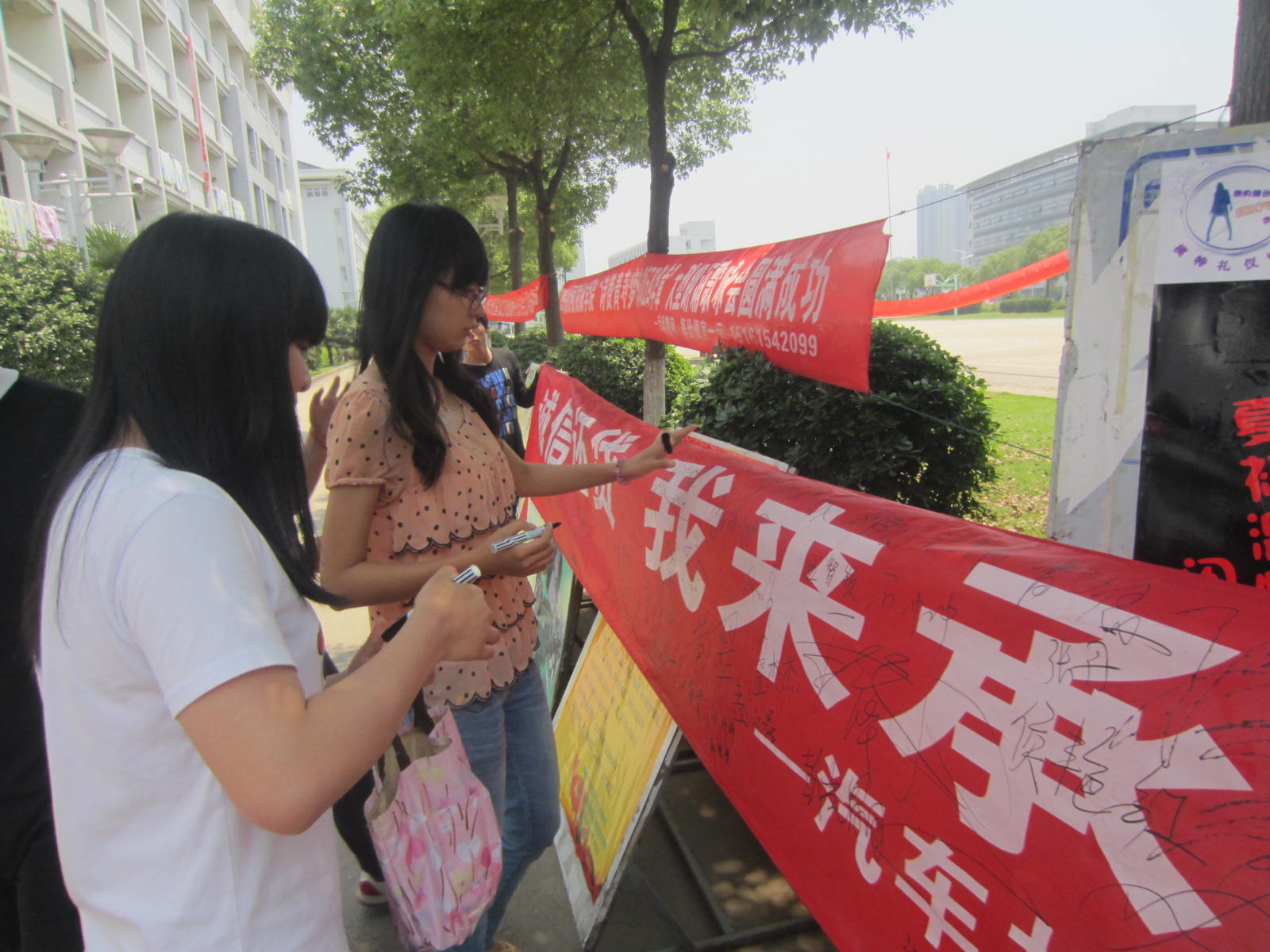 2013年6月3日,由汽车系举办的“诚信还贷,我来承诺”签名活动在梅园楼下吸引了众多师生的目光。短短几十分钟,5米长的横幅上就被老师和学生密密麻麻的签上了自己的名字。