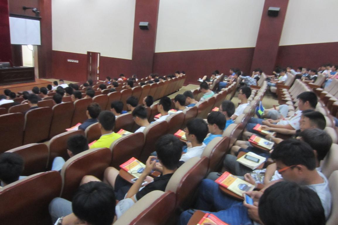 为更好地帮助年轻大学生树立正确的世界观、人生观、价值观,强化其国防观念,激发其爱国热情,培养他们坚强的意志及尚武精神,2014年6月10日下午,汽车系关工委在国际交流中心一楼报告厅举办了大学生与国防讲座。讲座由汽车系关工委秘书长高娜娜主持,特邀我校人武部副部长陶有远老师担任主讲,汽车系2012级、2013级各班共300余名学生参加了讲座。