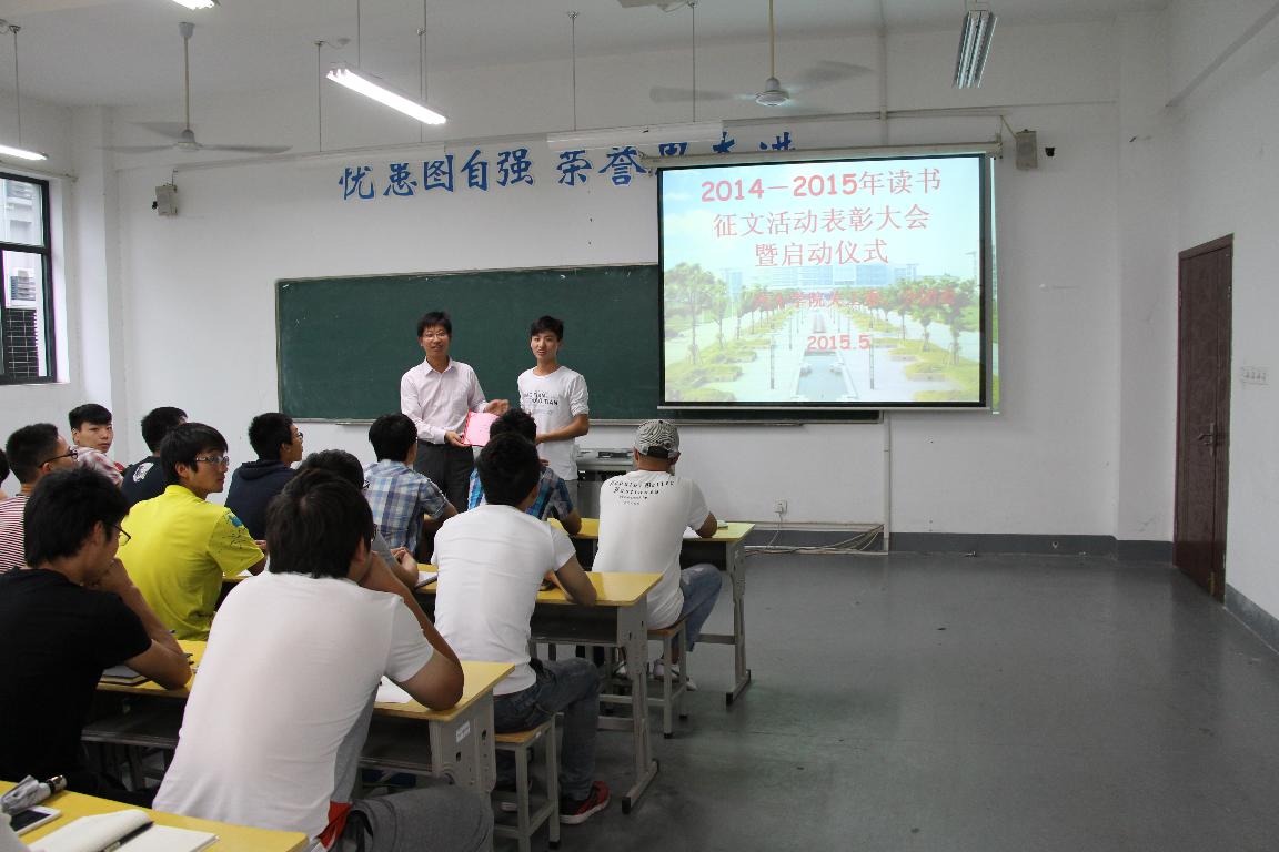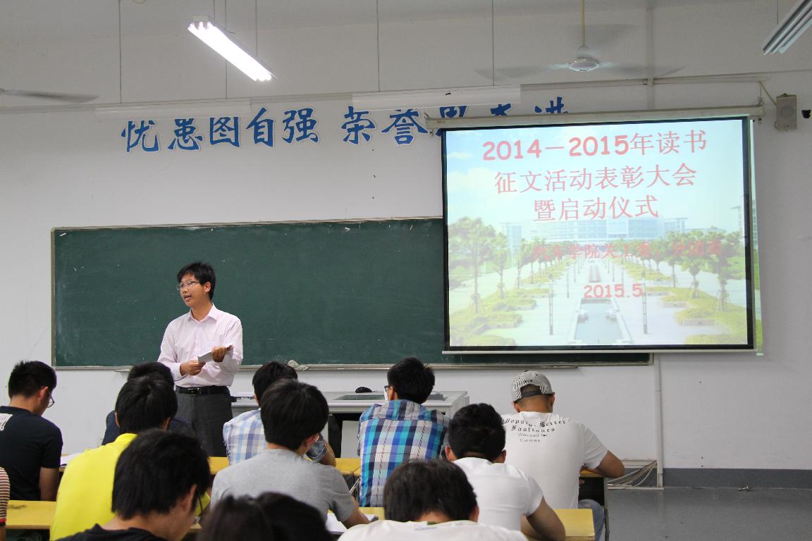 5月29日下午,我分院分团委副书记经卫国就征文一事在工b205召开了“2014-2015年读书征文活动表彰大会暨启动仪式”。会上,经卫国老师表扬了去年征文比赛的获奖者朱缓缓同学,随后就今年征文比赛展开了详细叙述,表达了他对此次征文比赛的殷切期望。同学们对此次比赛反响也十分强烈,大家都认为是一次锻炼自己和展现才华的绝好机会,纷纷踊跃报名。