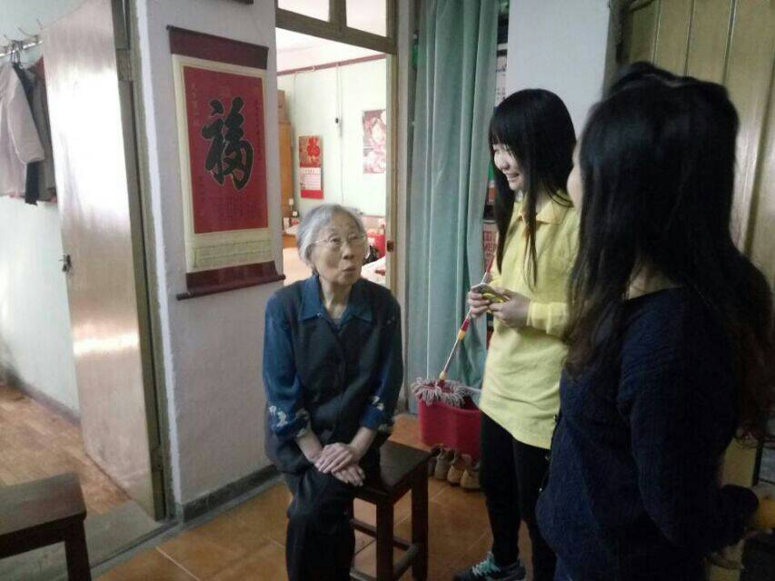 在社区主任的带领下,我们带着水果以表心意分别走访了四家。首先我们去的是一名台湾退休教师家,老人家见我们过去非常热情,“忙东忙西”招待我们。我们陪她唠家常,从聊天中我们也看出她当年实力相当。老人平时基本是一个人,所以我们陪她聊天,她从始至终满脸都洋溢着笑容。后来我们要走的时候她还带着一些不舍。接下来我们拜访的是一名艺术家,老人家琴棋书画样样精通,他把他当年作品拿给我们欣赏,给我们讲它们的故事与意义,我们很乐意并且很耐心的边听他讲边陪他聊天。由于老人家年纪稍大,手脚也不麻利,所以家里有点乱,我们决定给他家打扫卫生。值得表扬的是,我们的志愿者没有嫌弃老人家,也没有一句抱怨。后来我们又走访了两家,一家是退休干部,一家是“炒股大神”。我们帮他们扫扫地,陪他们聊聊他们感兴趣的话题。老人们脸上也多了一丝丝笑容,心里更是多了一份温暖。老人们都和我们拍照留念,记录下每一个微笑的时光。
