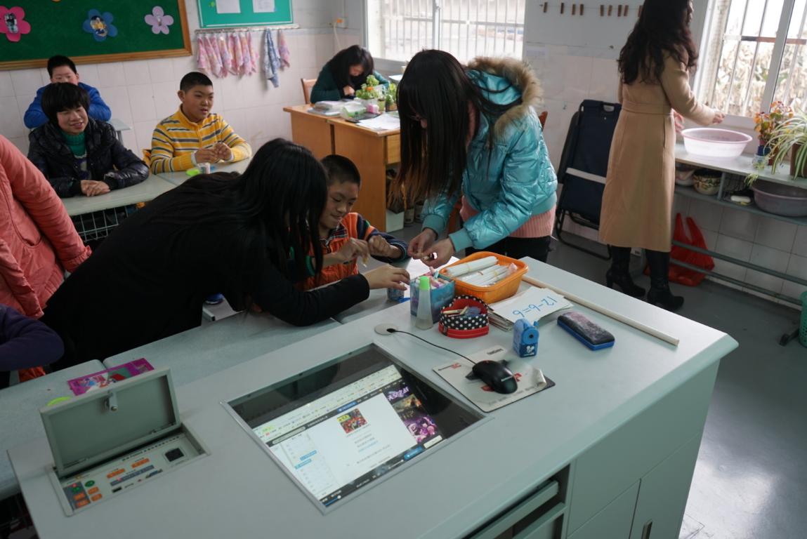 当日下午,志愿者们乘坐地铁,经过了一个小时的车乘终于来到了无锡锡山特殊教育学校。老师热情的接待了同学们,把同学们带进了五年级2班。一进班小朋友们都跑过来:“大姐姐,大哥哥,你们都好久没来了,我都想你们了。”想想同学们也有一个月没有见到这些纯真的笑脸了。这次同学们带着他们一起唱歌,他们给志愿者们表演了一段《小苹果》来表达喜悦之情。看着他们努力挥舞着手臂跟着节拍,同学们的心好像被触动了,也许他们和普通人并没有什么不同,只是他们更应该受到关怀。随后,志愿者们带领小朋友们一起玩橡皮泥、做纸工。虽然小朋友们在言语方面可能有障碍,可是他们在动手方面不输给常人。在和他们做游戏的过程中时间也在悄悄的流失。在我们要离开的时候,小朋友们还跑出来:“大姐姐,大哥哥,你们还要再来啊,这周五好么?”那种不舍的眼神让人不忍拒绝。当同学们问他们圣诞节有想说的话没,他们说的最多的三个字就是“我爱你”。这些天使用他们的方式表达了对世界的爱,对生活的爱。