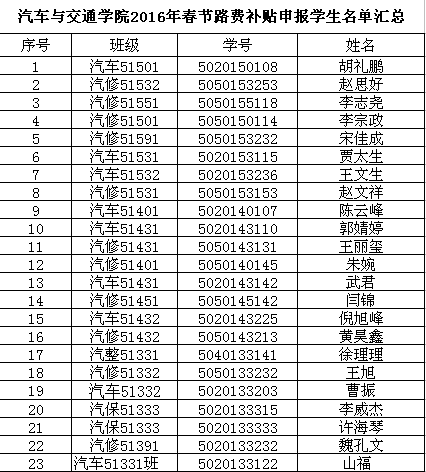 汽车与交通学院2016年春节路费补贴申报学生名单汇总
