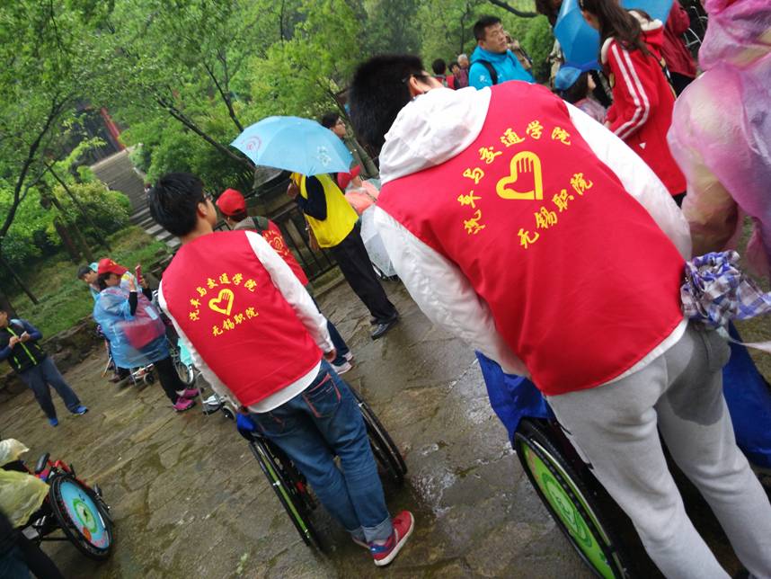 清晨6点,志愿者们怀着饱满的激情、满满的爱心在校门口集合出发。志愿者们身穿雨衣在极为恶劣的天气条件下,不畏艰难、勇往直前与来自全国各地的残疾人进行了爱心助游志愿服务。本次志愿活动整整持续了2天,活动第一天虽然下着暴雨却并没有影响到志愿者的热情,我分院志愿者宋佳成同学为了找回来自四川阿坝自治州残友丢失的背包而淋湿了全身,充分体现作为一名志愿者所该拥有的敬业精神。在前往灵山大佛旅游境地时,有一位来自河北石家庄残友的张长信,为了想近距离的接触和观赏大佛,在志愿者的服务和鼓励下,拖着残缺的身体、迈着艰难的手伐,成功地爬入大佛的面前。整个艰难的过程也让志愿者们看到了残友的身残志坚的精神。活动的第二天,残友们即将离开无锡,志愿者们积极地来到酒店帮助残友们收拾行李,送往汽车客运站。其中最令志愿者们感动的是一位来自江西省的美丽残疾人代表为我们志愿者们朗诵了一首她的原创诗:“我不知道你们的名字,但我知道你们共同的名字---志愿者;我不记得你们的模样,但我记得你们的笑容与温暖”。字字温暖,句句感人,在场的志愿者们无不流下感动的热泪。