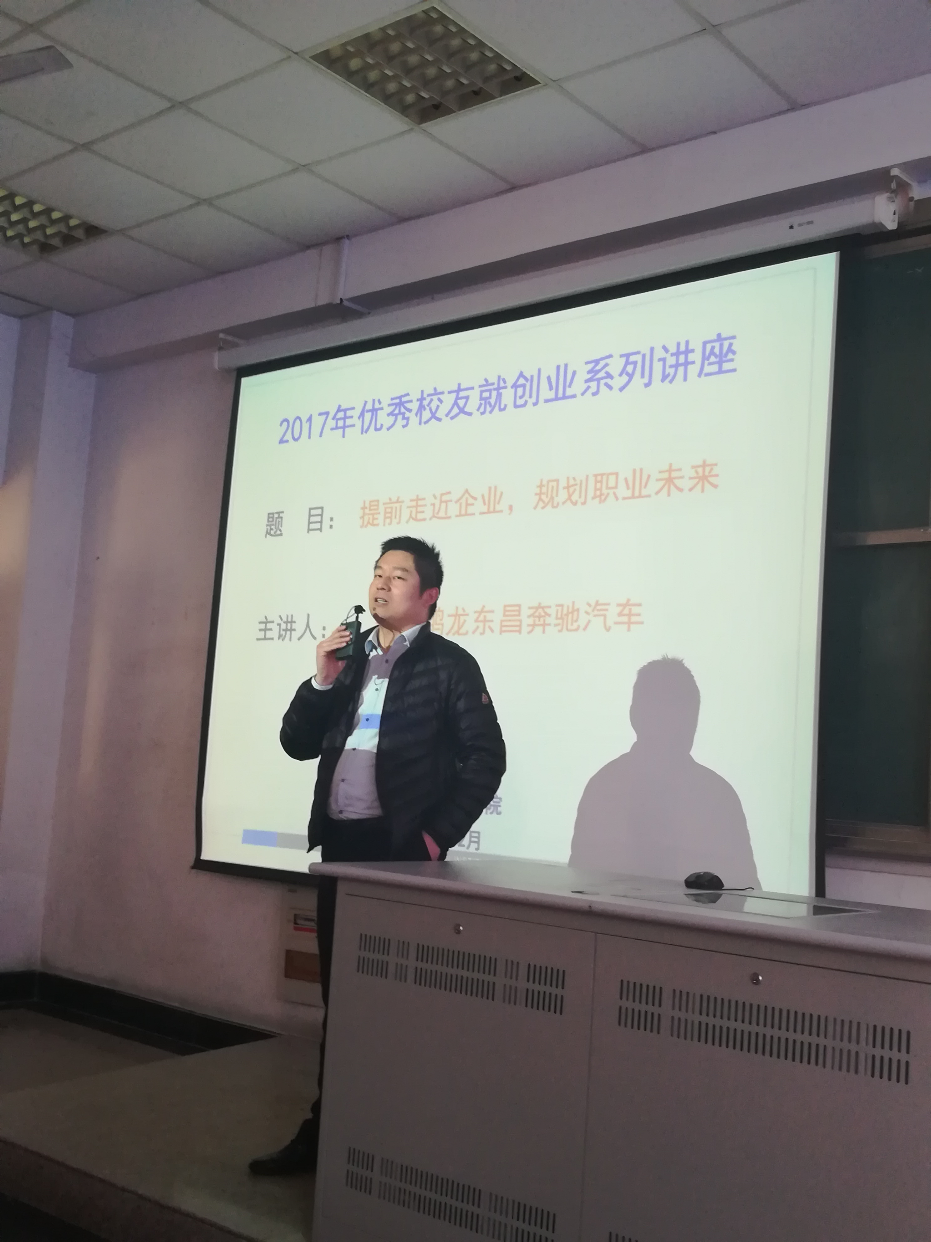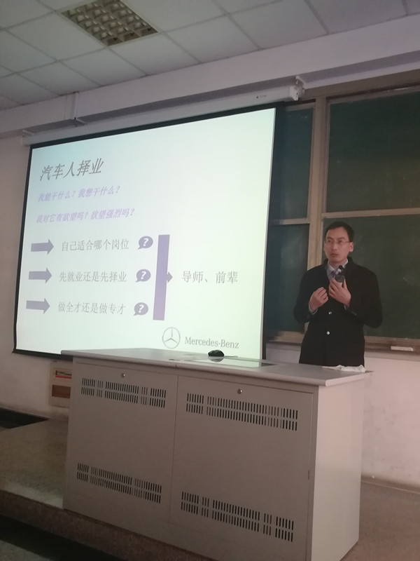 暨2017年11月举行首场就创业讲座以来,2017年12月8日下午,汽车与交通学院再次举行了系列讲座。本次讲座主讲人为苏州鹏龙东昌奔驰汽车销售服务有限公司的人事经理李晨、服务经理姜宝、事故保险专员蔡云龙等。