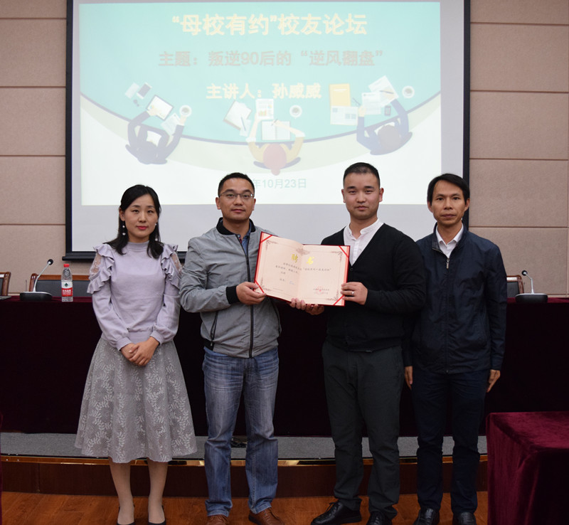 金秋十月,丹桂飘香,汽车与交通学院于10月23日下午在国际交流中心二楼报告厅举行了“母校有约”校友论坛活动。本次活动邀请到了我院优秀校友原汽修51071班学生、现欧尚集团(中国)投资有限公司市场部首席营运经理孙威威先生,他为同学作了“叛逆90后的“逆风翻盘”的主题讲座。学生处处长助理刘文庆、校友办刘玮、汽车与交通学院学工办主任徐锋以及汽车与交通学院100多位学生参加了活动。讲座开始前,刘文庆和刘玮、徐锋等三位老师代表学校为孙威威颁发了玛雅吧 兼职教师聘书。