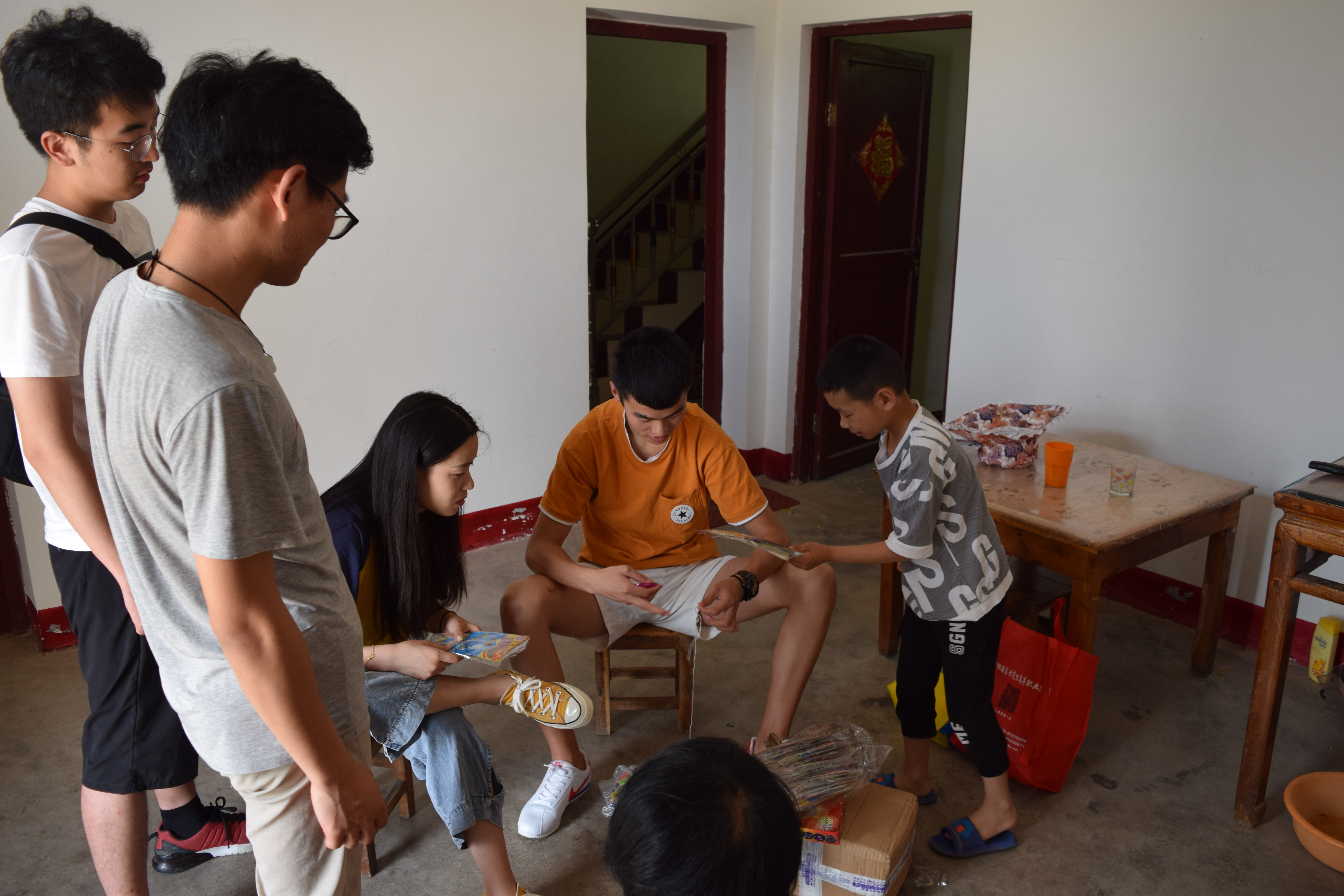 7月7日上午,志愿者团队来到灌南县新集镇金圩村,了解当地状况和留守儿童生活情况。志愿者们为孩子们准备了很多的文具,拿到文具的孩子们开心极了,露出了幸福的笑容。通过交流,志愿者们了解到,由于缺少父母的关爱和指导,大多孩子不愿和别人交流。了解到这一情况,志愿者们拿出提前准备好的玩具飞机,和他们一起拼装,主动拉近了与他们的距离。最后,孩子们与志愿者袒露心扉,也让志愿者真正的了解了他们的内心世界。
