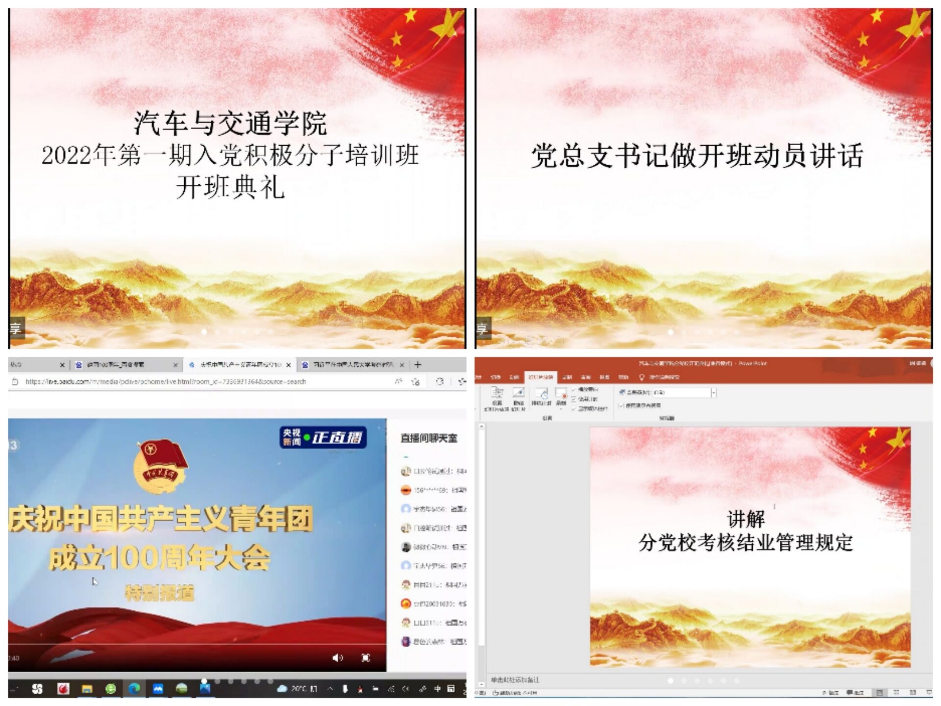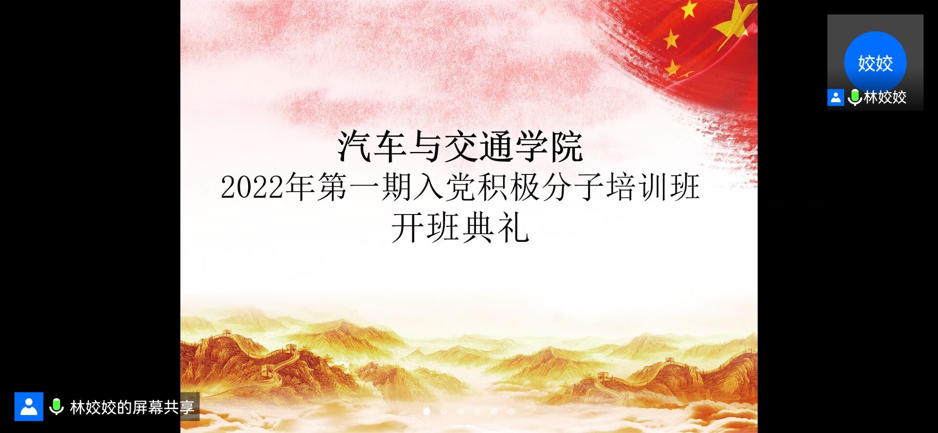 5月10日,汽车与交通学院2022年第一期入党积极分子培训班开班典礼采用线上的方式举行,汽车与交通学院党总支书记邹晔老师,党总支副书记丁正荣老师,汽车与交通学院学生党支部组织委员李唯老师、宣传委员高娜娜老师、纪检委员路晓丽老师以及31名入党积极分子参加了开班典礼。开班典礼由林姣姣老师主持。
