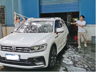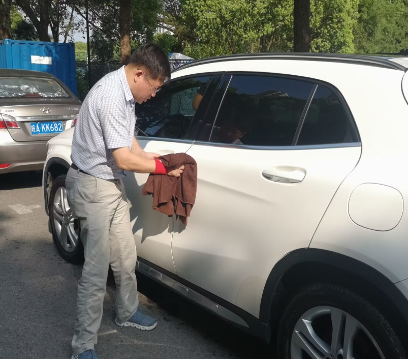有的志愿者先用高压水枪冲洗一遍车身,给汽车做个简单的清洁;有的志愿者接着将洗车液均匀地泼洒在车身上,然后其他志愿者用海绵擦洗车子的前后左右,认真细致地为车身敷上一层“泡沫面膜”,等“泡沫面膜”在车身上停留一会后,用洗车布仔仔细细地清理汽车上的每一个部位。教工党员们不放过任何一个角落,认真用力擦去车身上的污垢,不一会儿大家的额头上就布满了汗珠。但是无暇顾及,汗珠顺着脸颊滴落。最后志愿者用水枪冲洗车身,仔细清除车身上残留的污渍,最后将被冲洗干净的车身用吸水毛巾擦干。飞起的水珠将太阳的光芒折射进了每位老师的眼中,光亮的车身映照着老师们洋溢着笑容的脸,虽然过程是疲惫的,但是看着眼前一台台焕然一新的汽车,志愿者们的嘴角不禁微微上扬,感到奉献的快乐。