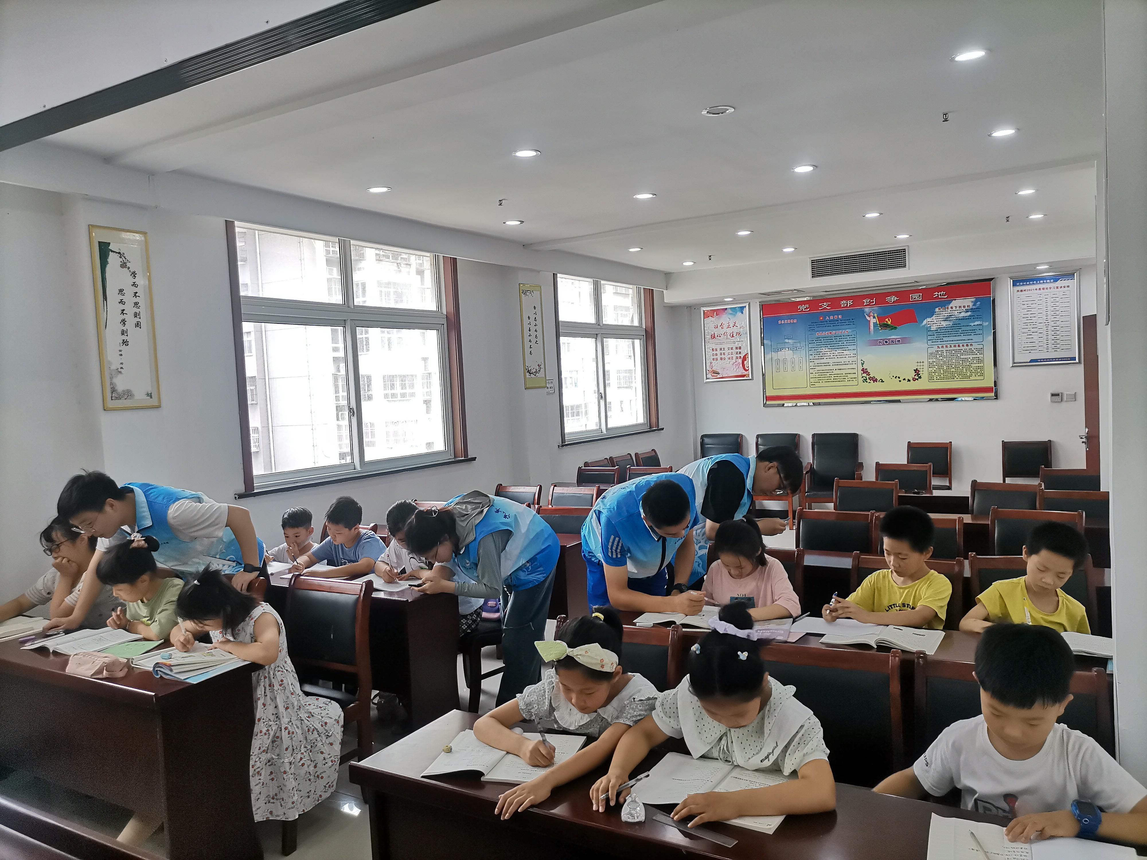 留守儿童与父母接触时间较少,课业辅导成了难题,为了培养留守儿童的学习兴趣,提升留守儿童的学习能力,“星火筑梦”实践团开展了“暖心陪伴、助学进步”课业辅导活动。小朋友们年龄跨度较大,志愿者们按照年级对小朋友进行了分组,同一年级的小朋友坐在一排。志愿者们在给小朋友辅导作业时,注重讲解解题思路,让小朋友学会学习方法,提升学习效率。还没有上小学的小朋友没有暑假作业,志愿者们便陪伴他们读书、画画,帮助小朋友拓展知识领域范围、培养兴趣爱好。