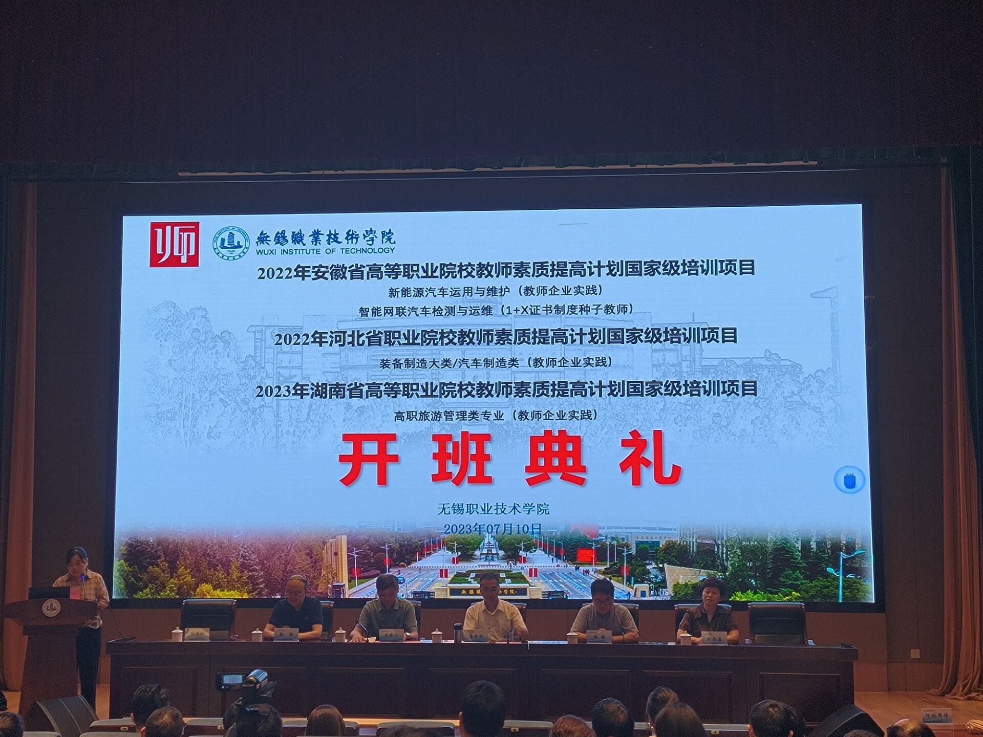 7月10日,2022安徽国培1+X证书制度种子教师(智能网联汽车检测与运维)培训项目在无锡职业技术学院开班。玛雅吧 校长龚方红教授、安徽省高等学校师资培训中心常务副主任袁德水、张韬、继续教育学院副院长曹冬美、汽车与交通学院党总支书记张美娟以及培训班全体学员50人出席了开班仪式。