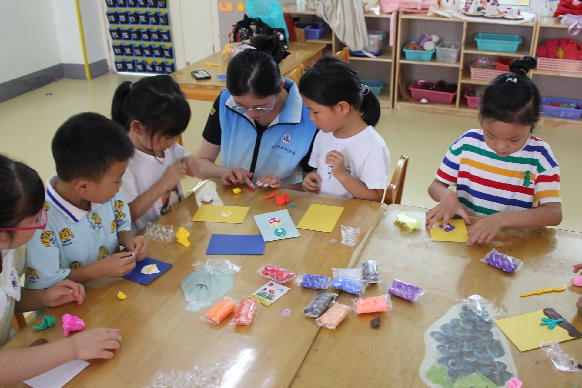图为实践团成员教小朋友作泥塑。