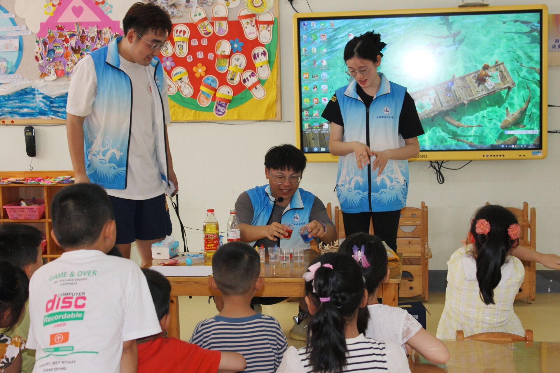 图为实践团成员在做“调色大师”科学小实验。