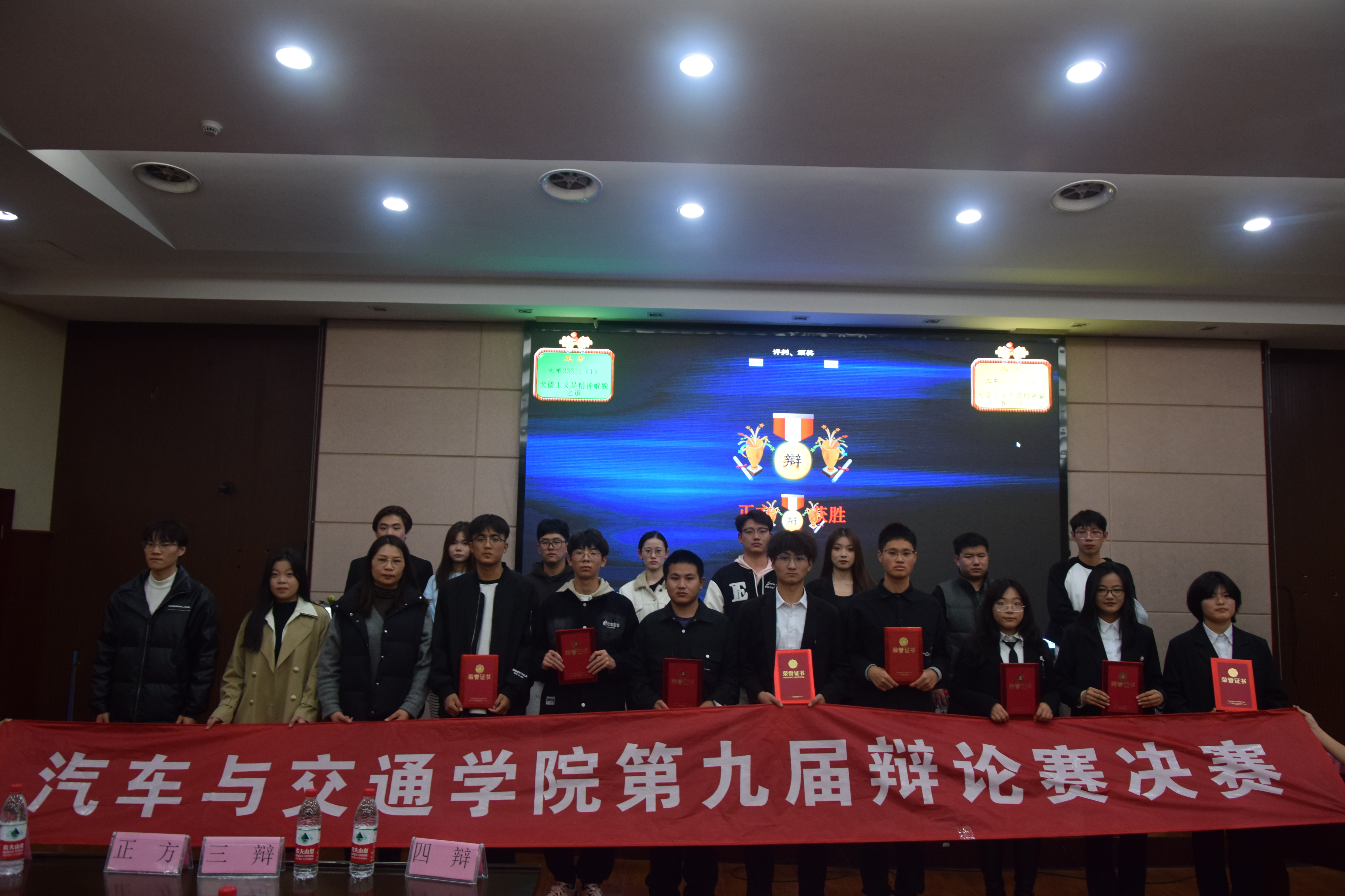 经过激烈的交锋对峙,比赛评委结合两支队伍的综合表现,最终确定空中乘务23321班二队获得冠军,空中乘务23321班一队获得亚军。赛后,评委钱森阳、丁成洋、李德望、杨逸分别对辩手们的精彩辩论进行点评,班主任李玲玲老师为两队辩手颁发证书,并合影留念。