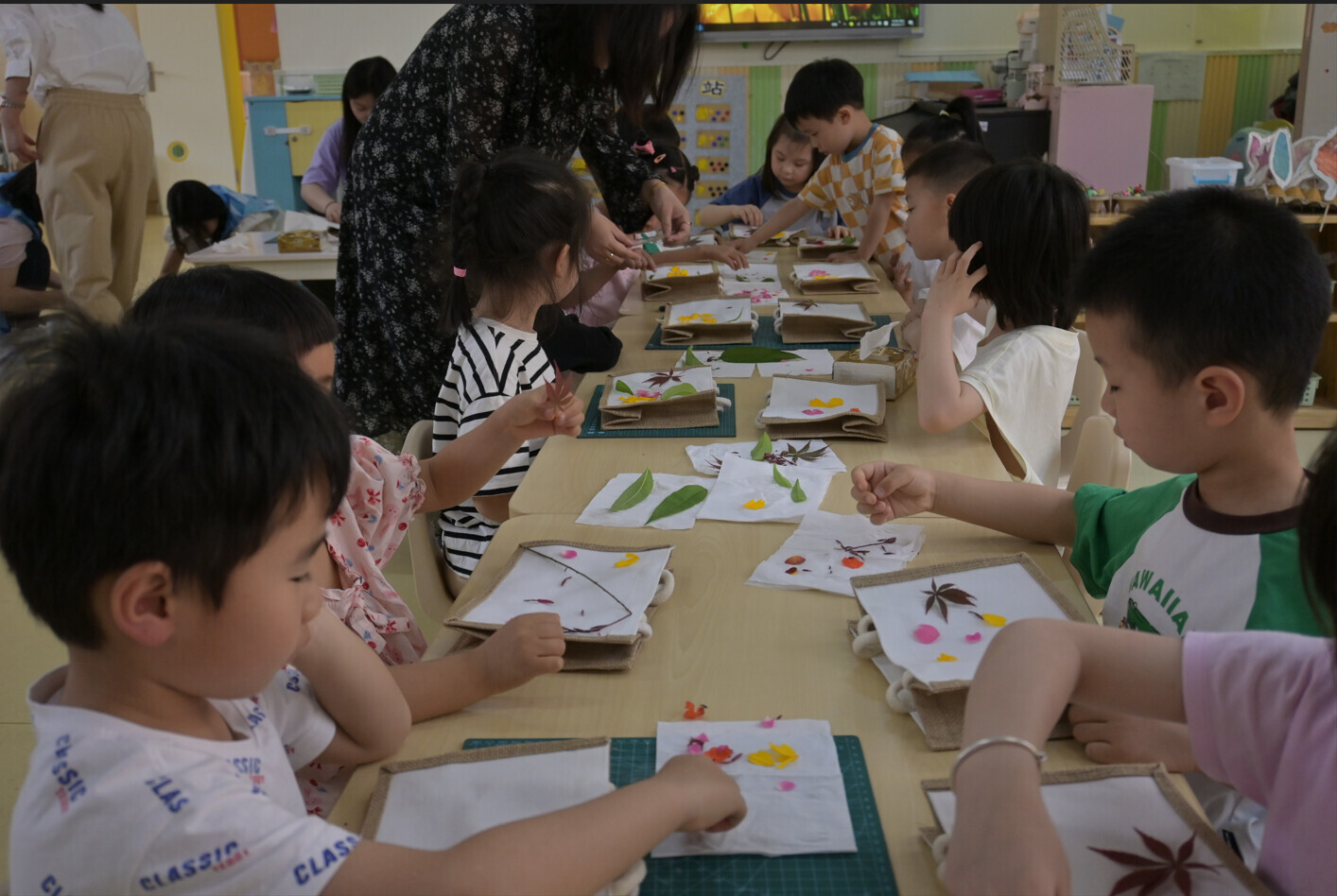 志愿者们还为小朋友们带来了中国非遗工艺——植物拓染。志愿者们介绍了植物拓染的历史渊源和技艺特点,并挑选了各种新鲜的植物叶片和花朵,使用专业的拓染工具,将植物中的色素均匀地敲打到棉布袋上,逐渐形成层次丰富、色彩艳丽的图案。小朋友们发挥自己的创造力,对花瓣、树叶进行不同的排列组合,经过一段时间的努力,一幅幅精美的植物拓染作品相继完成。