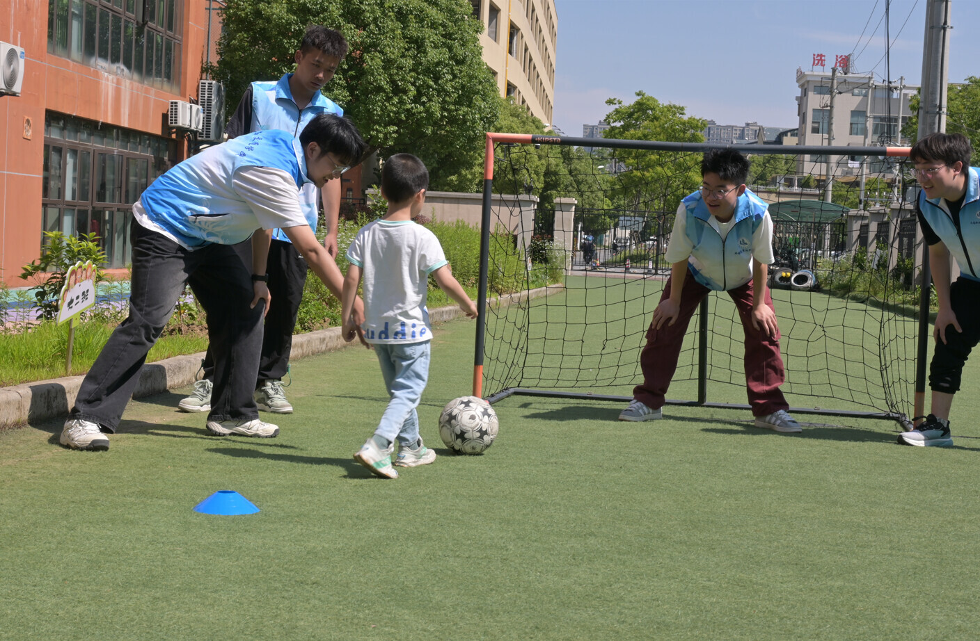 活动过程中,志愿者带领小朋友们分别进行了户外足球赛、儿童手势舞、缤纷粘土画和手工植物拓染四个主题活动。在户外足球赛中,志愿者对踢足球的基本动作进行了详细的讲解和示范,然后教小朋友带球过障碍物。随后志愿者们组织小朋友们分组比赛,让他们在实际比赛中感受足球的魅力,培养团队合作精神。