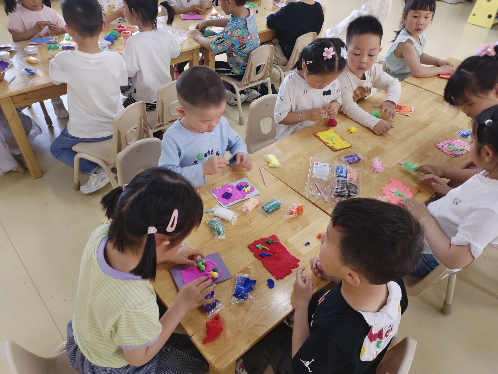 在缤纷粘土画制作过程中,志愿者们先向小朋友们介绍了超轻粘土的基本特性和制作方法。小朋友们发挥想象力和创造力,在志愿者展示的成品粘土画上还加入了许多自己的想法,创造出一幅幅独一无二的粘土画。