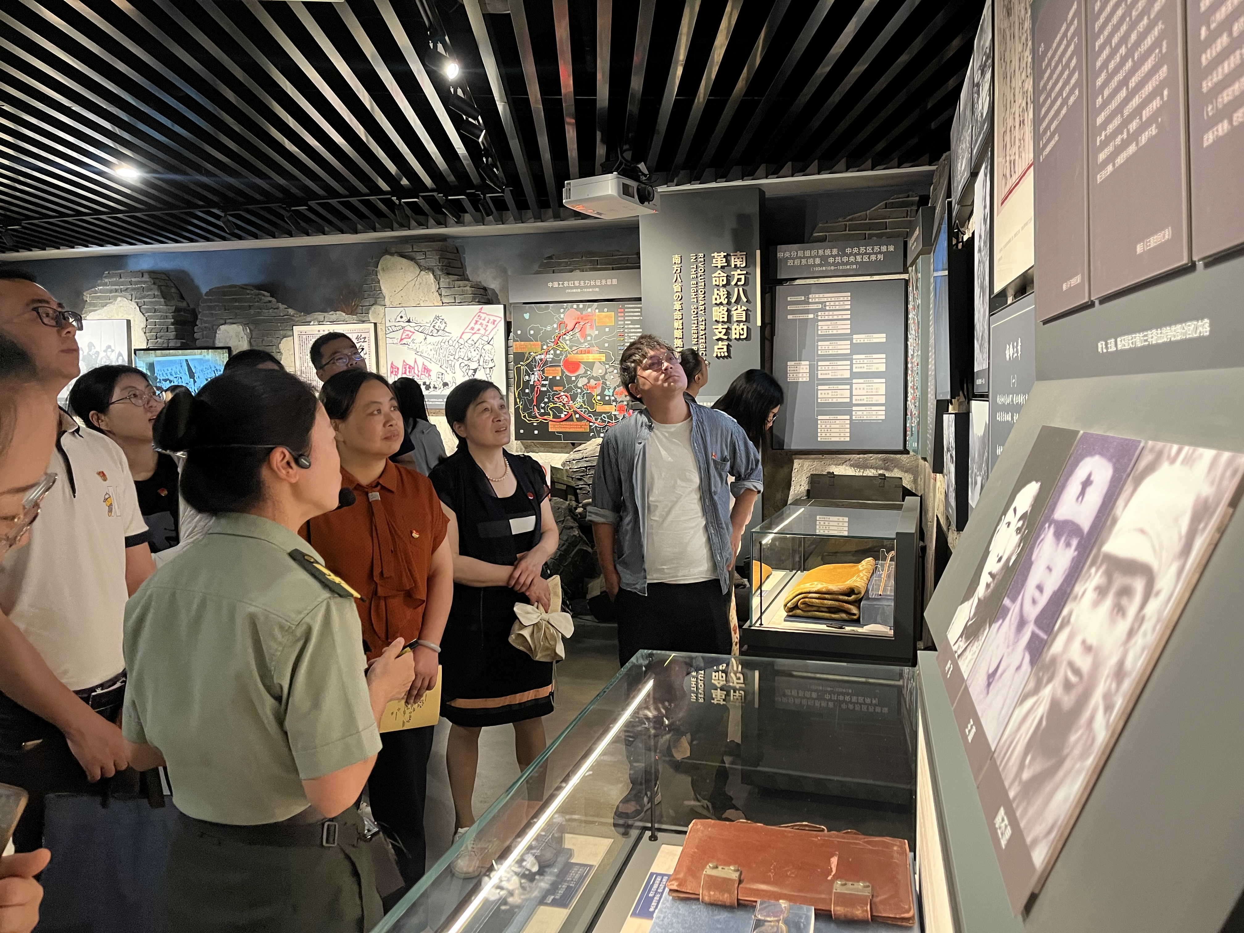新四军江南指挥部纪念馆依托新四军江南指挥部旧址而建,曾是陈毅、粟裕等老一辈革命家办公场所。在新四军江南指挥部纪念馆,党员们通过聆听讲解员的讲述观看珍贵的历史文物,深刻感受到新四军在抗日战争时期的艰苦卓绝和英勇奋斗。徐金凤为青年教师党员介绍了部分抗战文物,并勉励他们积极传承红色信仰、勇于奋斗拼搏。