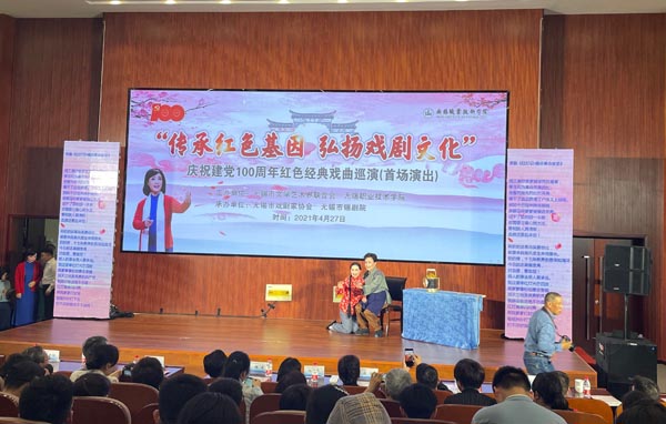 4月27日下午,传承红色基因、弘扬戏剧文化——庆祝建党100周年红色经典戏曲启动仪式及首场巡演在我校国际交流中心一楼报告厅隆重举行,无锡市文联、无锡市戏剧家协会领导及艺术家代表,我校党委书记朱爱胜、副校长杨雪琴参加启动仪式。我校400余名师生到场观看了演出。