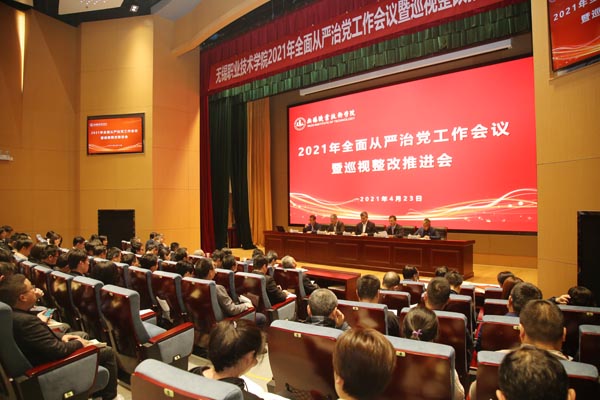 4月23日,学校在综合楼报告厅召开2021年全面从严治党工作会议暨巡视整改推进会。全体校领导、党委委员、校纪委委员、全体中层干部、各二级党组织纪检委员、巡视整改办公室成员参加了会议。