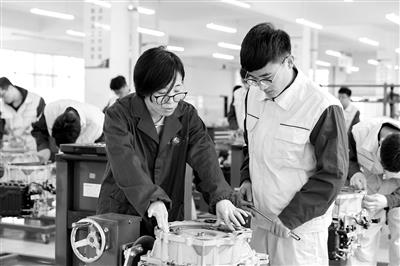 日照职业技术学院积极推进课程体系建设与改革,图为该校教师指导学生学习自动变速箱技术。