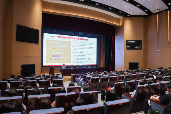 课上,校领导们从国际国内发生的重要事件导入,通过丰富的实例和详细的资料,围绕回顾三中全会历史、描绘改革崭新蓝图和领悟全会伟大意义三个部分向同学们全面介绍了党的二十届三中全会及其《决定》的概况。校领导指出:《决定》内容的3大板块、15个部分、60条举措,进一步全面深化改革的主题、指导思想、总目标、重大原则、改革举措、根本保证布局宏阔、路径清晰。并结合生动案例对这次改革侧重改革实效和增强人民获得感进行阐释,勉励同学团结在以习近平同志为核心的党中央周围,高举改革开放旗帜,凝心聚力、奋发进取,为全面建成社会主义现代化强国、实现第二个百年奋斗目标,以中国式现代化全面推进中华民族伟大复兴而努力奋斗。