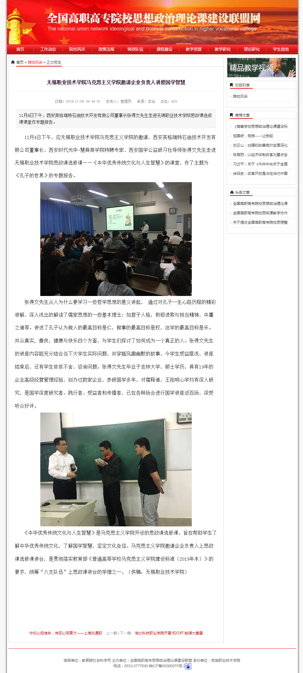 全国高职高专思想政治理论课建设联盟网报道我校马克思主义学院邀请企业负责人讲授国学智慧