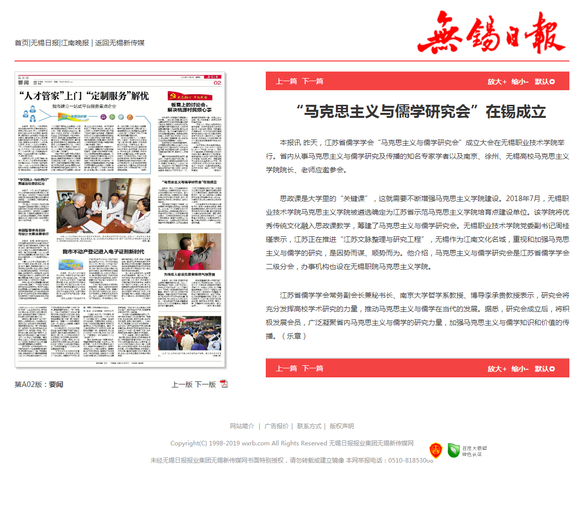 无锡日报报道我校“马克思主义与儒学研究会”在锡成立