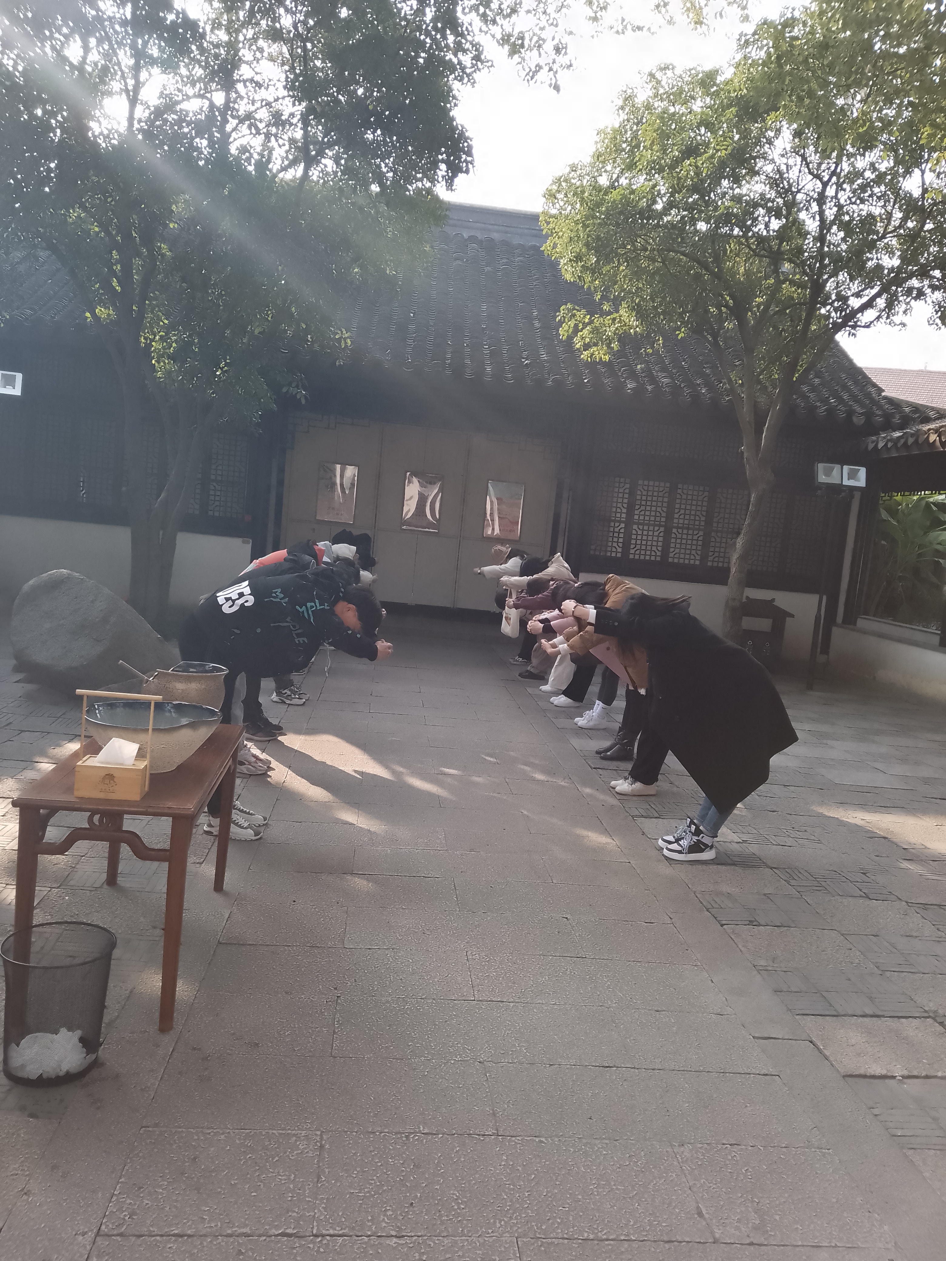 在东林书院,讲解员给参观的师生详细介绍了“东林旧迹”门牌的历史沧桑、泮池的历史变迁、东林精舍的讲学风尚和东林书院的整个格调布局。师生们在东林精舍的丽泽堂和依庸堂两个重要的讲学场所进行了现场教学研讨,重温顾宪成面对权贵的刚正不阿、高攀龙面临阉党迫害的从容赴死,感受到东林先贤的高洁品性和风骨。随后在工作人员的引导下,师生们前往供奉孔子的圣殿参加拜师礼体验,师生端正肃立、纠仪官整饰衣冠、行揖拜礼、净手由侧门进入孔子圣殿、诵《大学》首章、行揖拜礼、由侧门出、殿外行揖拜礼,揖别圣人先师。体验活动后,师生们自由参观东林汉服工坊、君子六艺工坊等景点。
