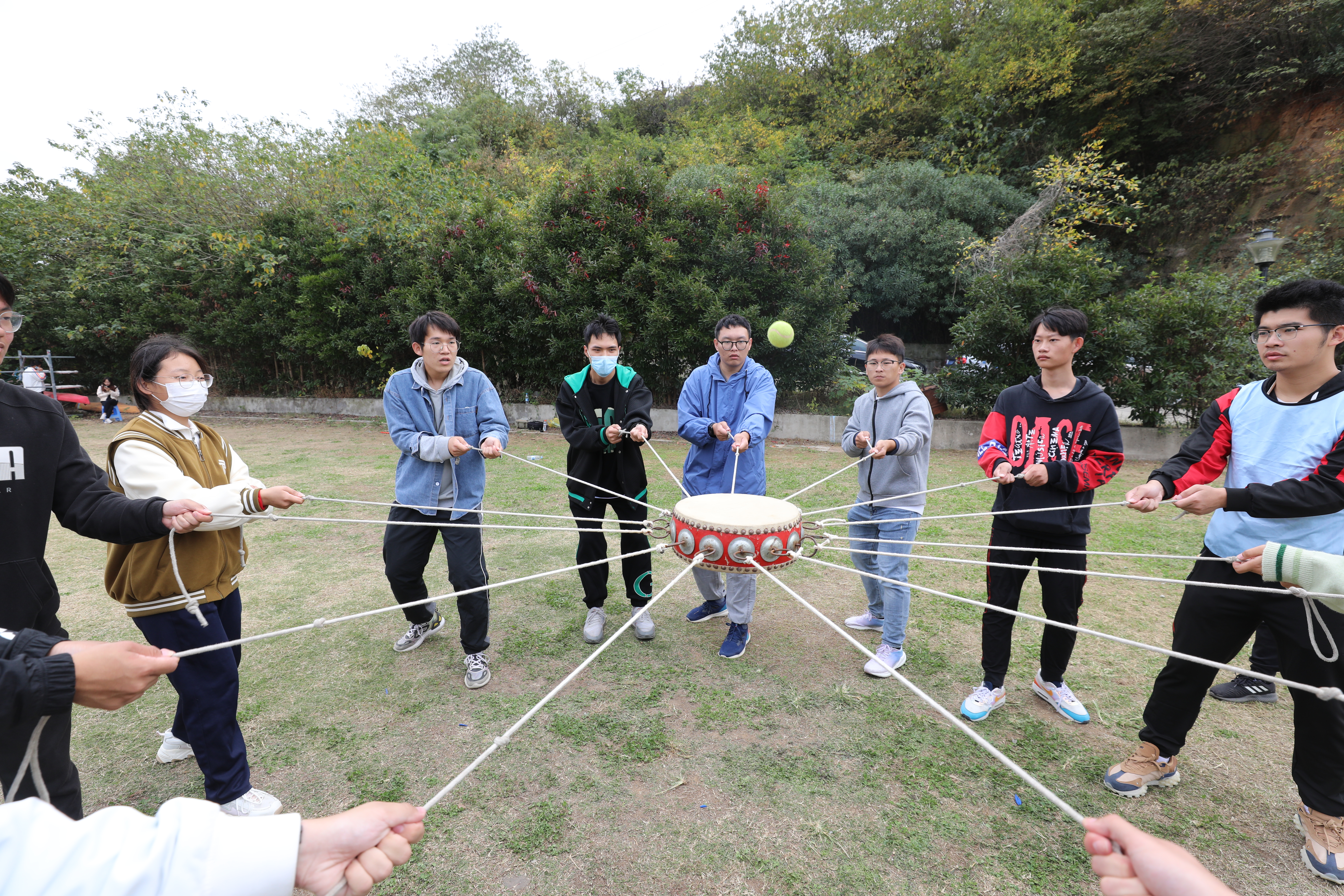 在充满活力、激情澎湃的组队仪式中,各支队伍不仅极富创意地为本队命名,而且以青年学生特有的朝气与幽默将队伍口号着墨于各队“战旗”之上。之后,同学们便热情洋溢地投入到富有趣味性、挑战性的四大素质拓展项目中。“生死与共”当之无愧地被同学们称为最具挑战性的项目,旨在考验同学们的信任度、默契度和团结度,不仅参赛的同学要学会步调一致、彼此支撑、互相鼓励、同舟共济,队伍中其他热心的同学也会主动坐在铁索一端充当参赛同学的“人肉平衡器”。当参赛同学遇到困难时,观赛的同学们便会给予坚定鼓励;当其顺利通过后,现场又会爆发出由衷的赞扬与掌声……“同心鼓”则极为考验小组的整体配合度,每支队伍不仅积极尝试、彼此鼓励,而且认真反思并总结经验教训,力求每一次颠球都能取得新的突破。在比赛过程中,每支参赛队伍都会不约而同地一边颠球、一边高喊着颠球的次数,而且声音的高低与颠球次数成正比,这既是对自我的肯定,同时也是对成员的默契鼓励。“四国大战”是全场最为热烈、分贝最高的活动,但同时又是最考验“智慧沟通”的项目。比赛前,各支队伍便开启脑力风暴,积极商讨本队策略。有用“前后左右”指挥的,有用“几点钟方向”提示的,还有用角度丈量的……由于观赛同学们极富热情、卖力高喊,虽极大提升了项目的热烈度,同时也为参赛选手人为增添了不少干扰度,这促使参赛选手要不断排除干扰、静心分辨,这也恰是这一项目的乐趣所在。“旱地冰壶”则是最受欢迎的项目之一,极大考验参赛同学的手脑配合能力和团队合作能力,不仅要确保投掷出去的冰壶落在预判落点范围内,而且要“保护队友、为难对手”,投掷的位置要能同时给对手造成一定障碍。每次投掷后,现场或爆发出充满喜悦的欢呼声,或忍不住发出“重了、轻了、远了、近了”的惋惜声,而后每位选手都会暗自揣度上一轮投掷的力度和角度,试图在下一次投掷中能够发挥出更好水平。