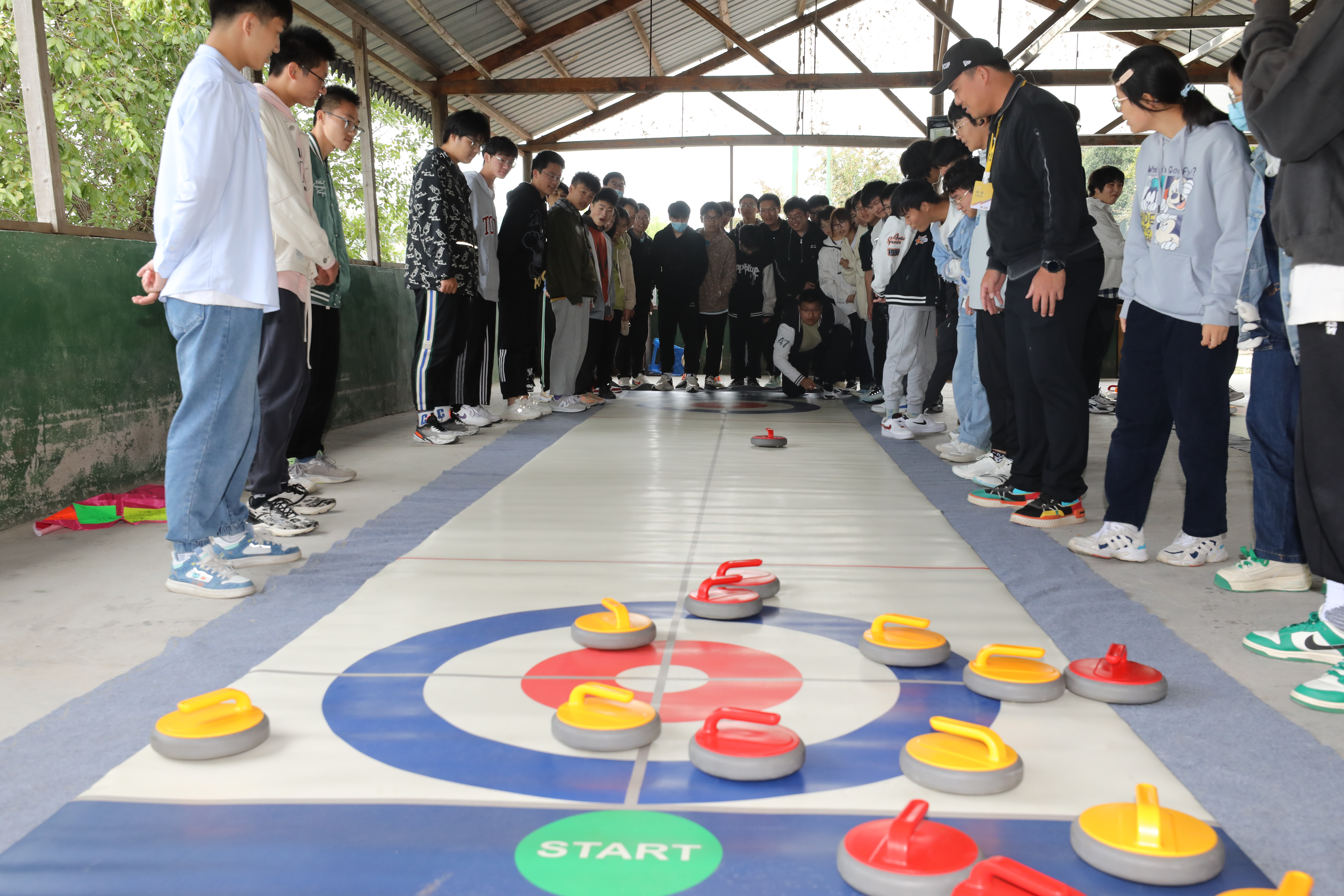 在充满活力、激情澎湃的组队仪式中,各支队伍不仅极富创意地为本队命名,而且以青年学生特有的朝气与幽默将队伍口号着墨于各队“战旗”之上。之后,同学们便热情洋溢地投入到富有趣味性、挑战性的四大素质拓展项目中。“生死与共”当之无愧地被同学们称为最具挑战性的项目,旨在考验同学们的信任度、默契度和团结度,不仅参赛的同学要学会步调一致、彼此支撑、互相鼓励、同舟共济,队伍中其他热心的同学也会主动坐在铁索一端充当参赛同学的“人肉平衡器”。当参赛同学遇到困难时,观赛的同学们便会给予坚定鼓励;当其顺利通过后,现场又会爆发出由衷的赞扬与掌声……“同心鼓”则极为考验小组的整体配合度,每支队伍不仅积极尝试、彼此鼓励,而且认真反思并总结经验教训,力求每一次颠球都能取得新的突破。在比赛过程中,每支参赛队伍都会不约而同地一边颠球、一边高喊着颠球的次数,而且声音的高低与颠球次数成正比,这既是对自我的肯定,同时也是对成员的默契鼓励。“四国大战”是全场最为热烈、分贝最高的活动,但同时又是最考验“智慧沟通”的项目。比赛前,各支队伍便开启脑力风暴,积极商讨本队策略。有用“前后左右”指挥的,有用“几点钟方向”提示的,还有用角度丈量的……由于观赛同学们极富热情、卖力高喊,虽极大提升了项目的热烈度,同时也为参赛选手人为增添了不少干扰度,这促使参赛选手要不断排除干扰、静心分辨,这也恰是这一项目的乐趣所在。“旱地冰壶”则是最受欢迎的项目之一,极大考验参赛同学的手脑配合能力和团队合作能力,不仅要确保投掷出去的冰壶落在预判落点范围内,而且要“保护队友、为难对手”,投掷的位置要能同时给对手造成一定障碍。每次投掷后,现场或爆发出充满喜悦的欢呼声,或忍不住发出“重了、轻了、远了、近了”的惋惜声,而后每位选手都会暗自揣度上一轮投掷的力度和角度,试图在下一次投掷中能够发挥出更好水平。
