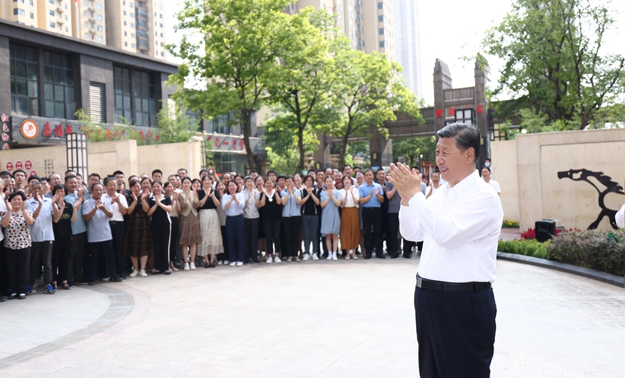 2022年6月28日,习近平总书记在东湖高新区左岭街道智苑社区广场同干部群众亲切交流。新华社记者 鞠鹏 摄