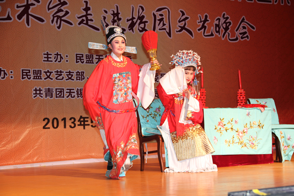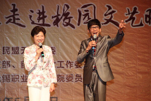 5月16日晚,民盟无锡市委组织艺术家们来到我校,为师生呈现了一场传统文化视听盛宴。市委统战部副部长唐英彪,市政协学习文史委主任丁坚,民盟无锡市委主委金征宇、副主委皮何总,我校领导朱爱胜、谈向群、华坚、顾京及9所在锡高校领导出席活动并观看了演出。晚会节目异彩纷呈,洋溢着浓郁的无锡地方特色,笛子、二胡、越剧、滑稽戏、京歌等艺术表演形式令现场观众沉醉其中,做为压轴曲目,锡剧艺术大师、梅花奖得主小王彬彬演唱的《沙家浜·祖国的好山河寸土不让》更是赢得满堂喝彩。